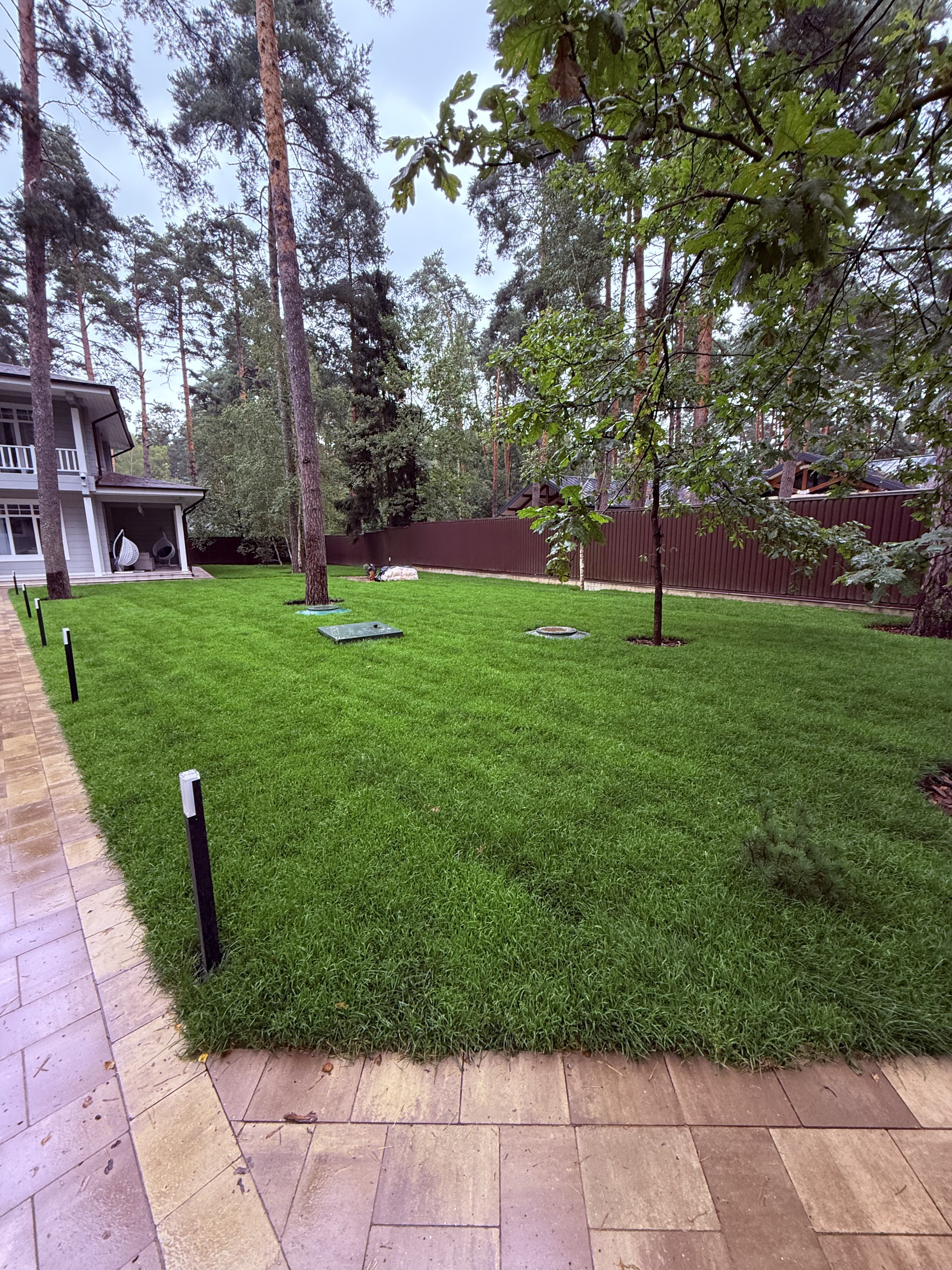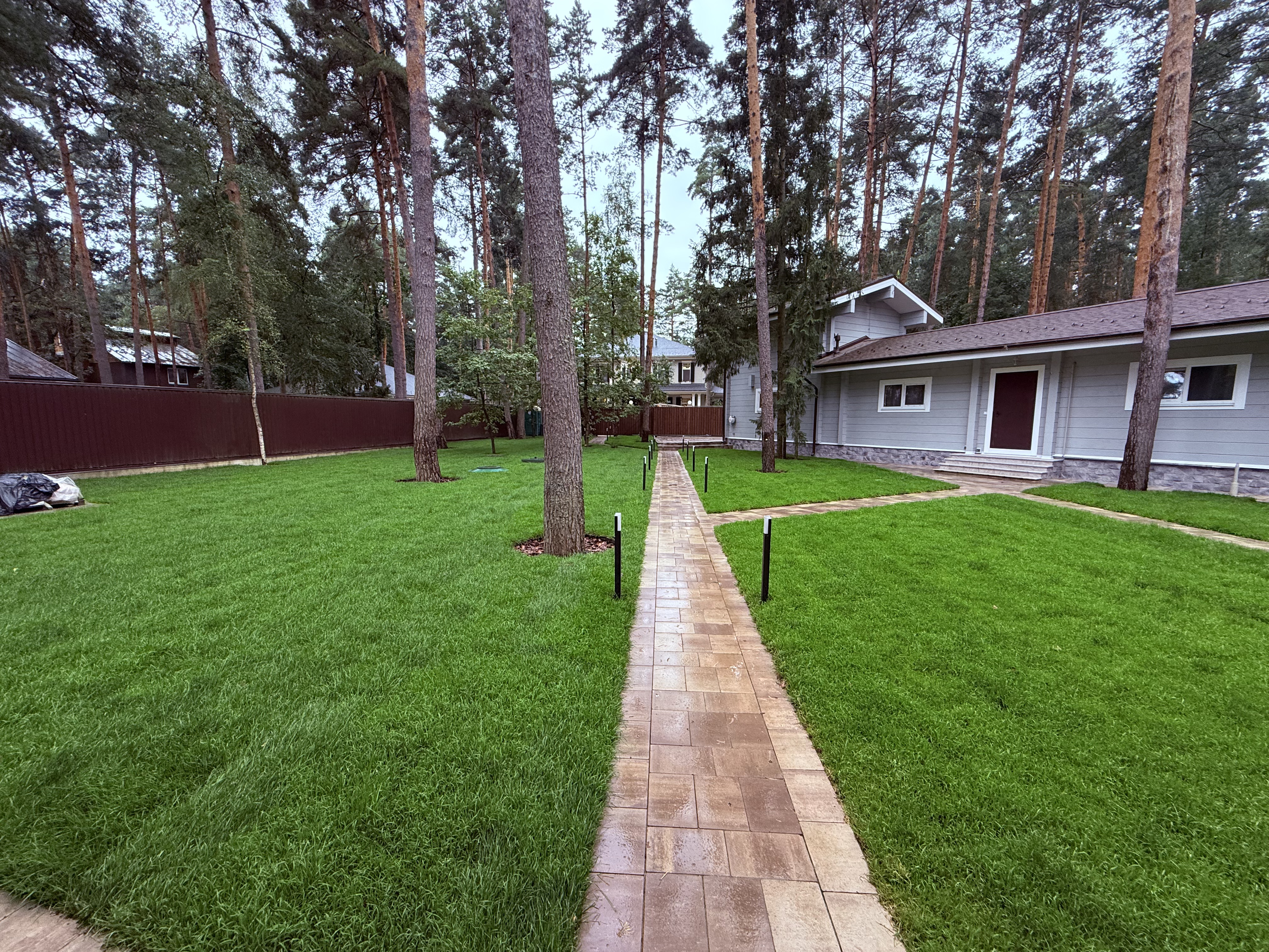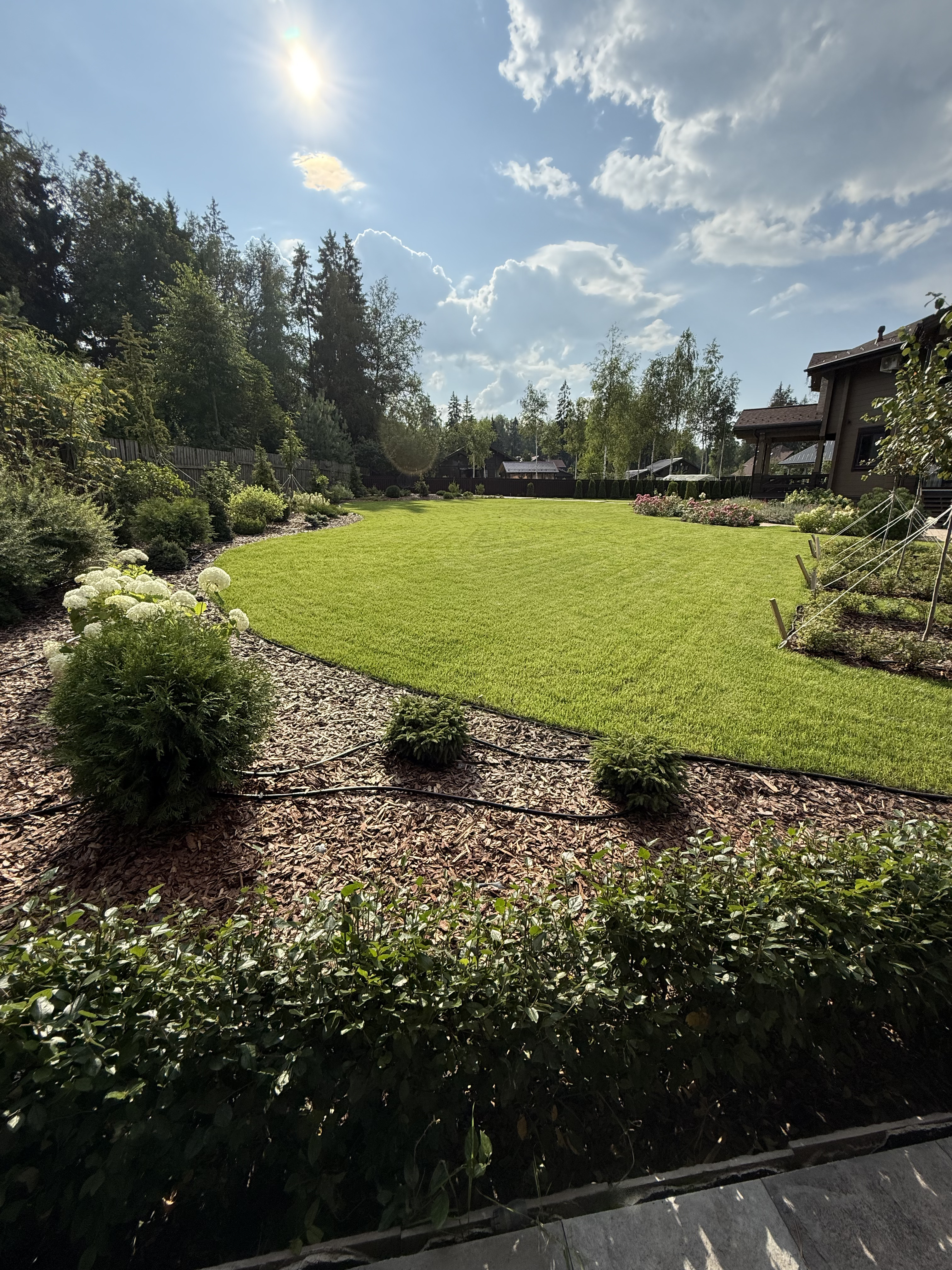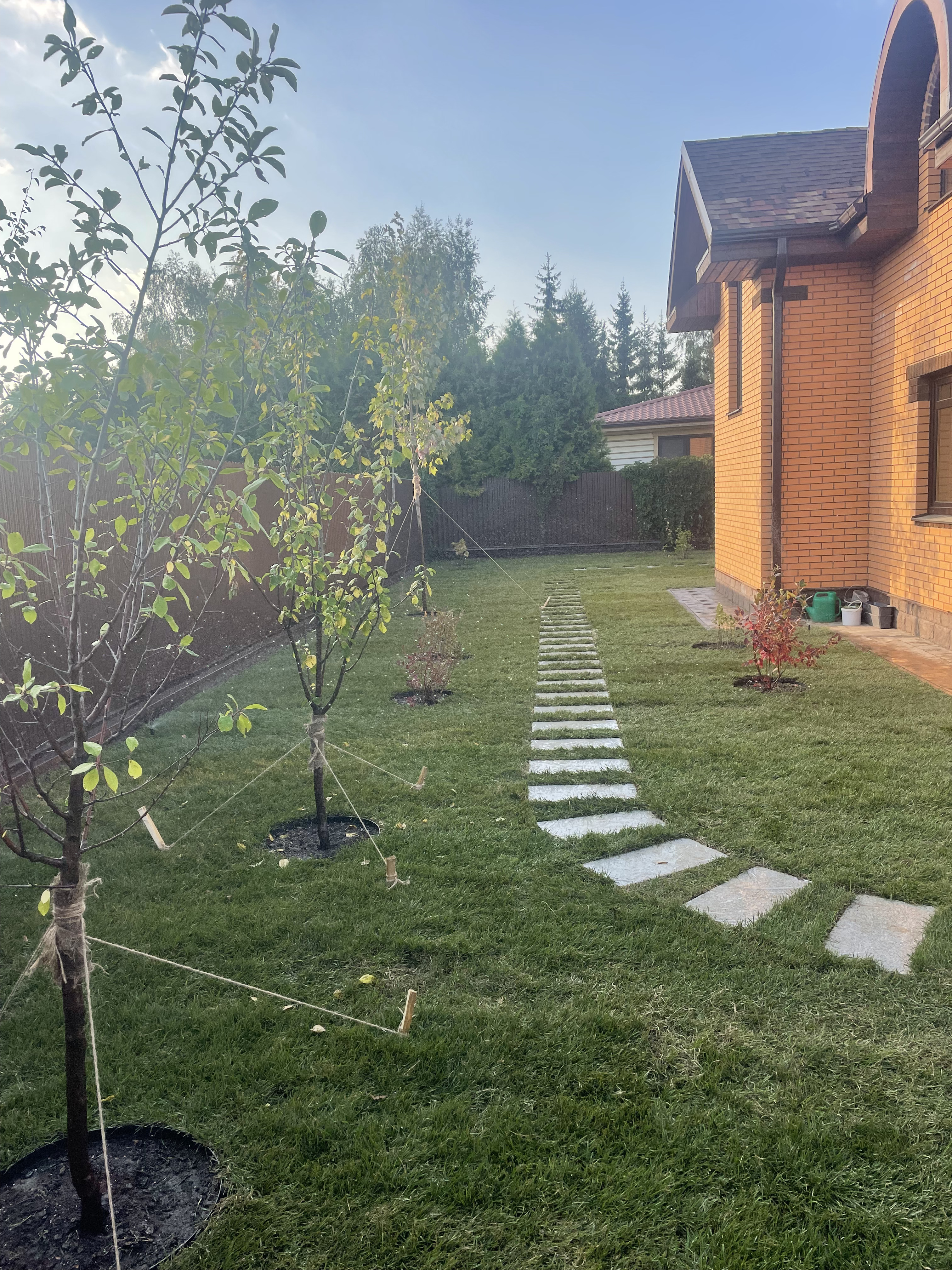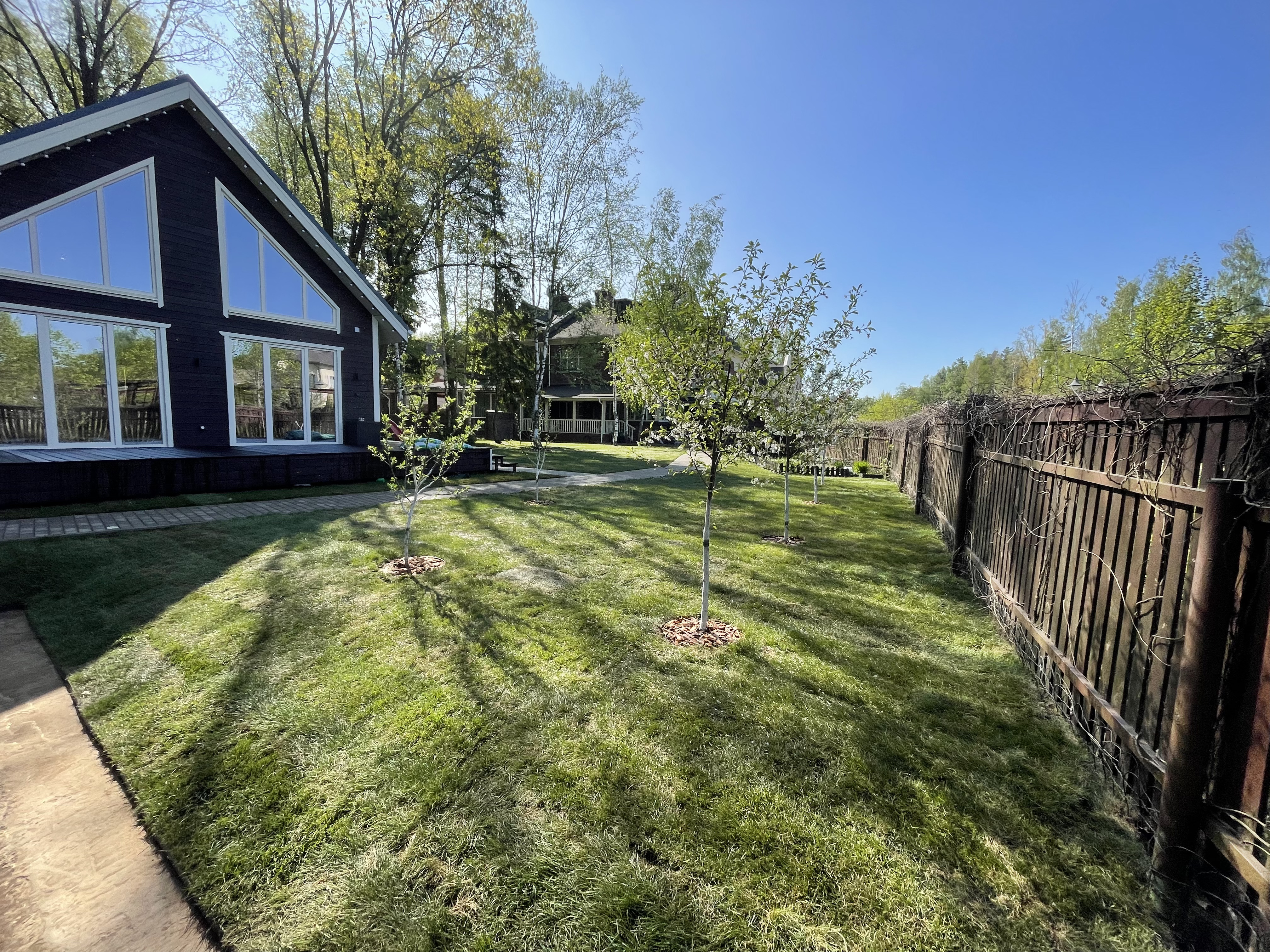 Газон вокруг дома и высадка деревьев. Дом на участке 1500 м²