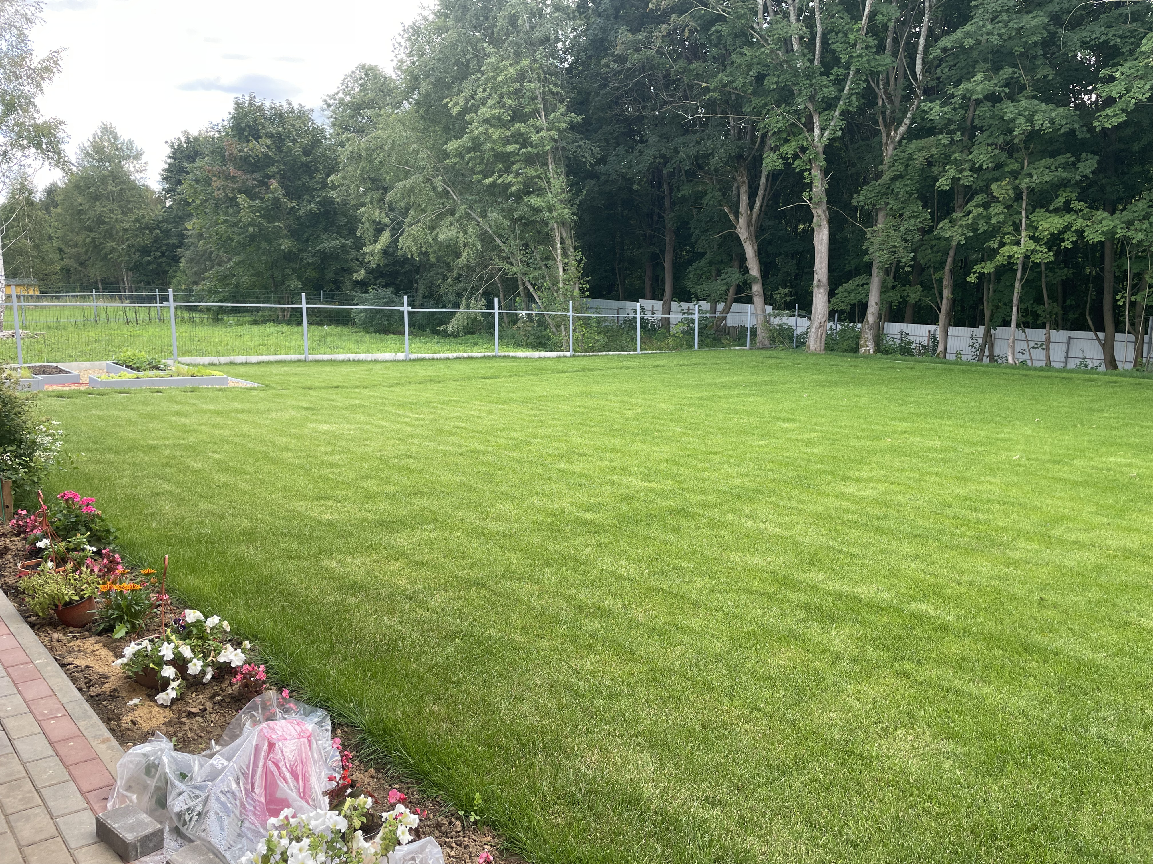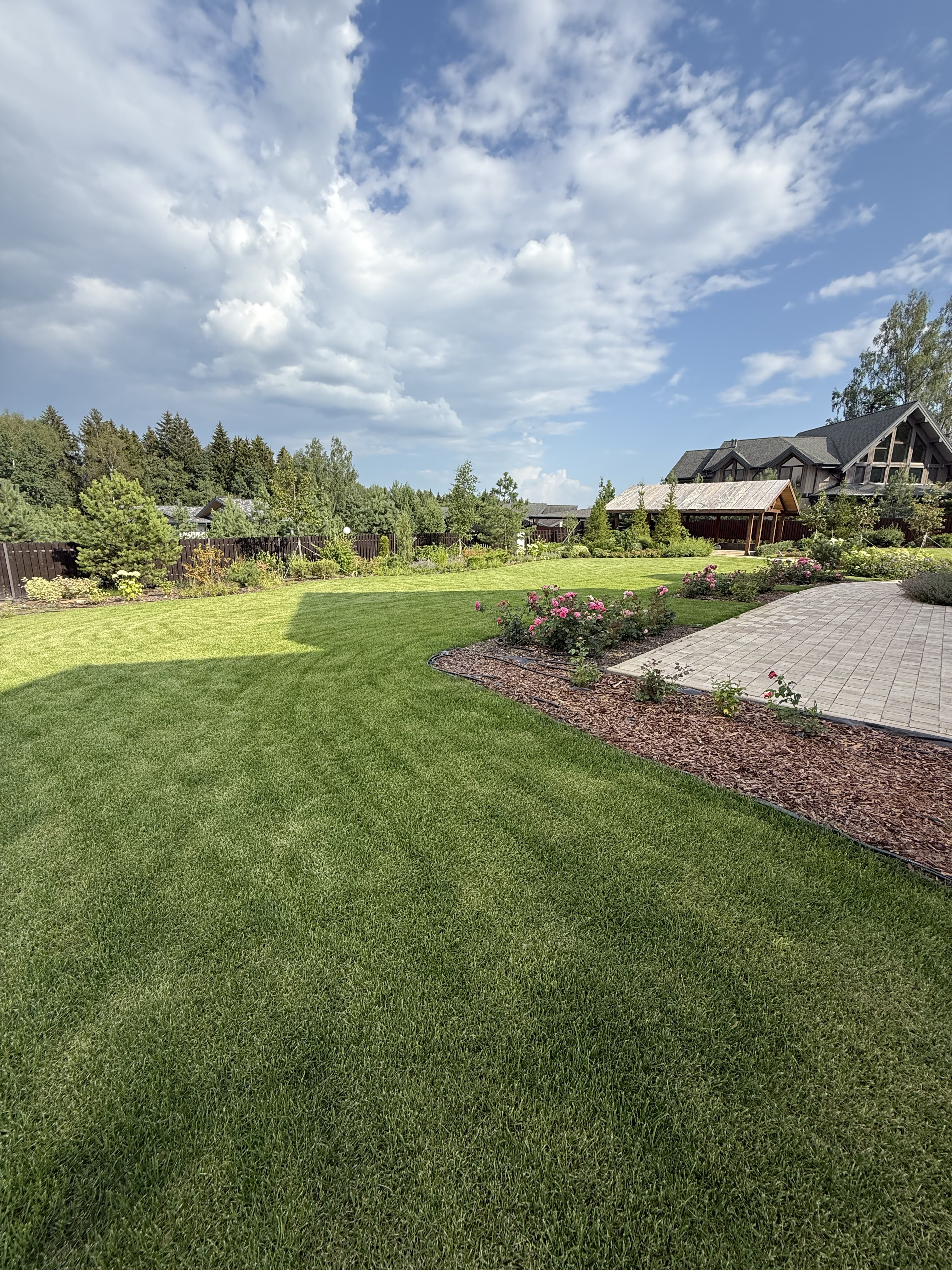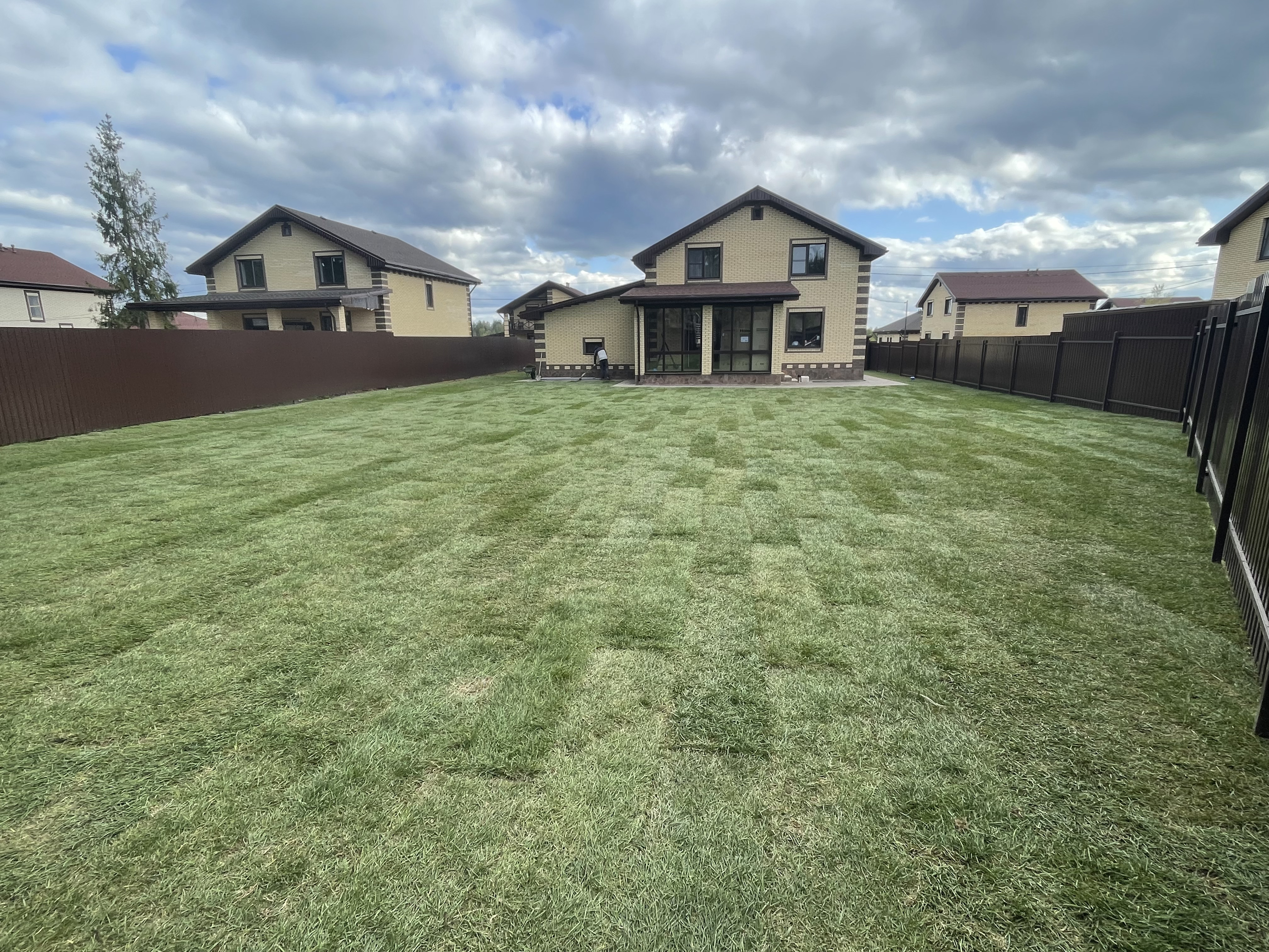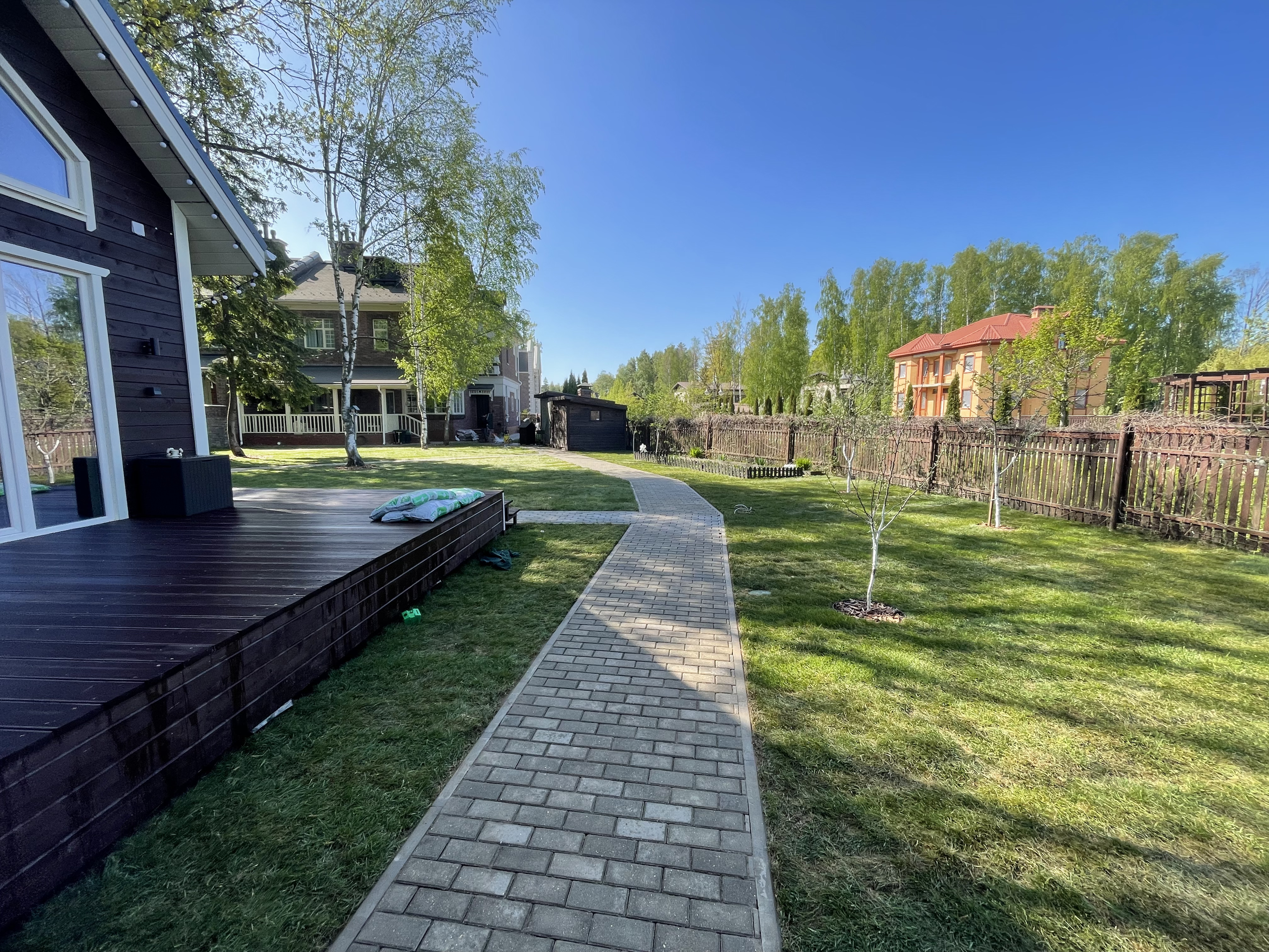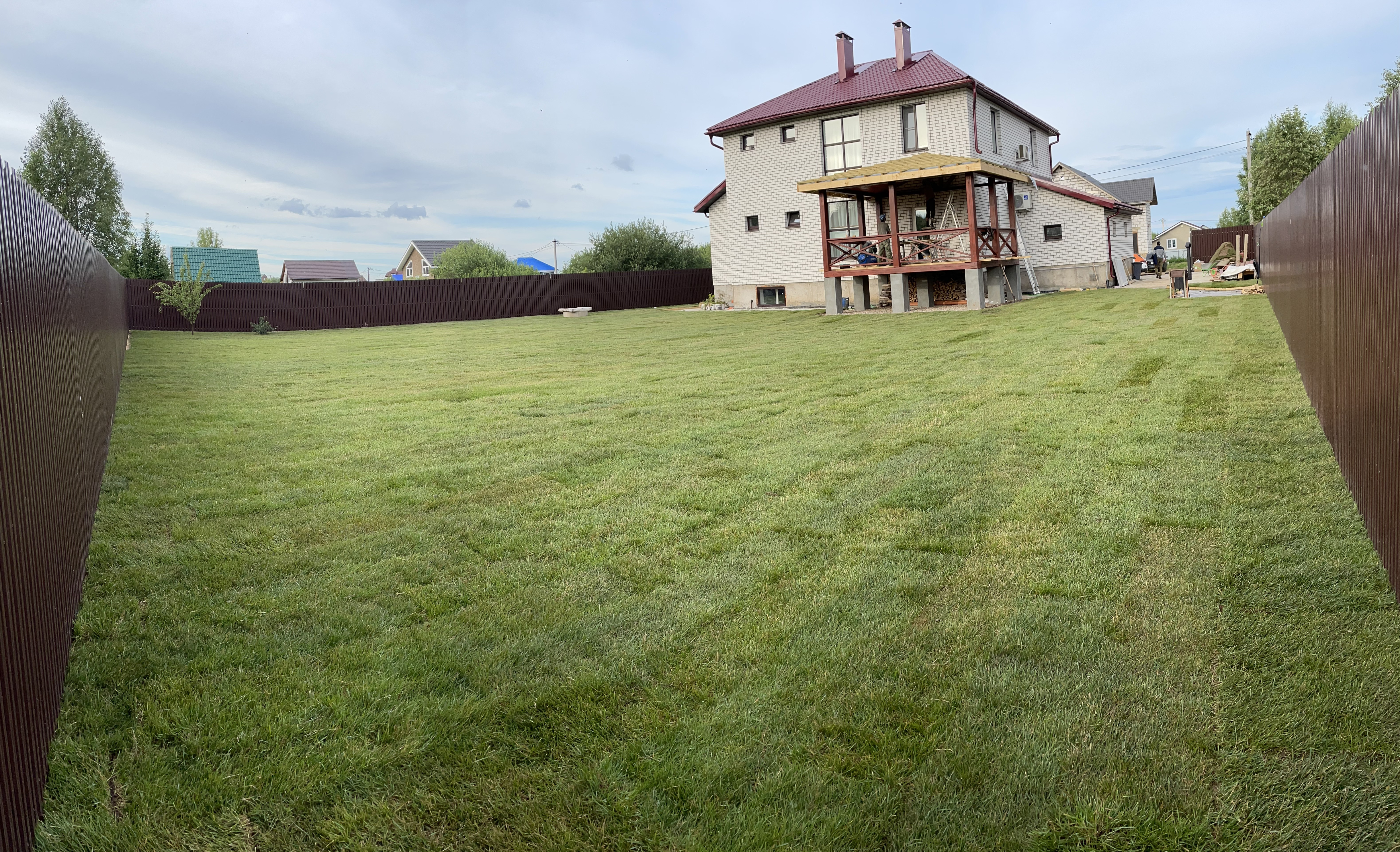 Газон вокруг дома и высадка деревьев. Дом на участке 1500 м²