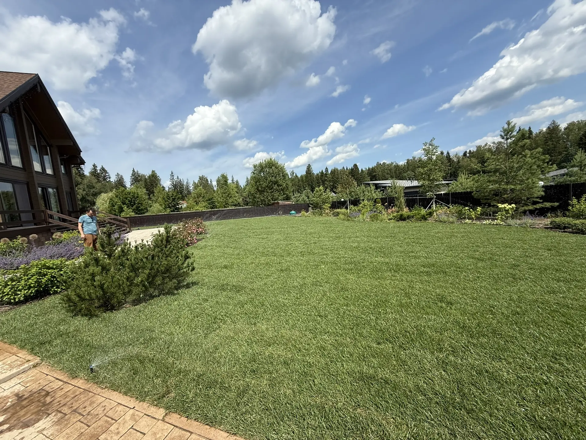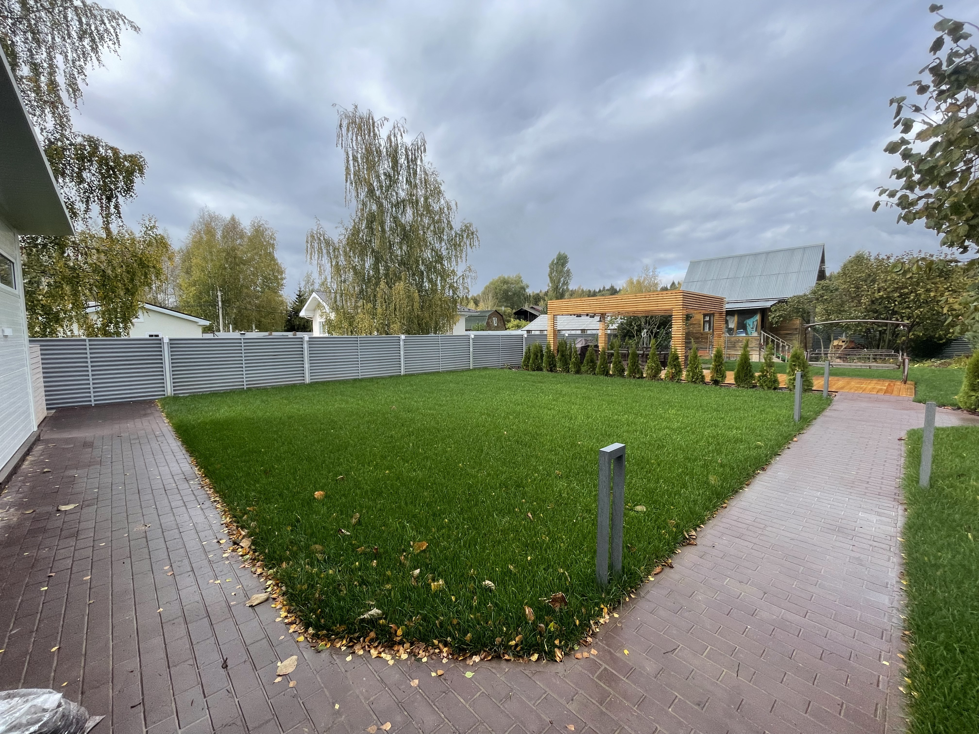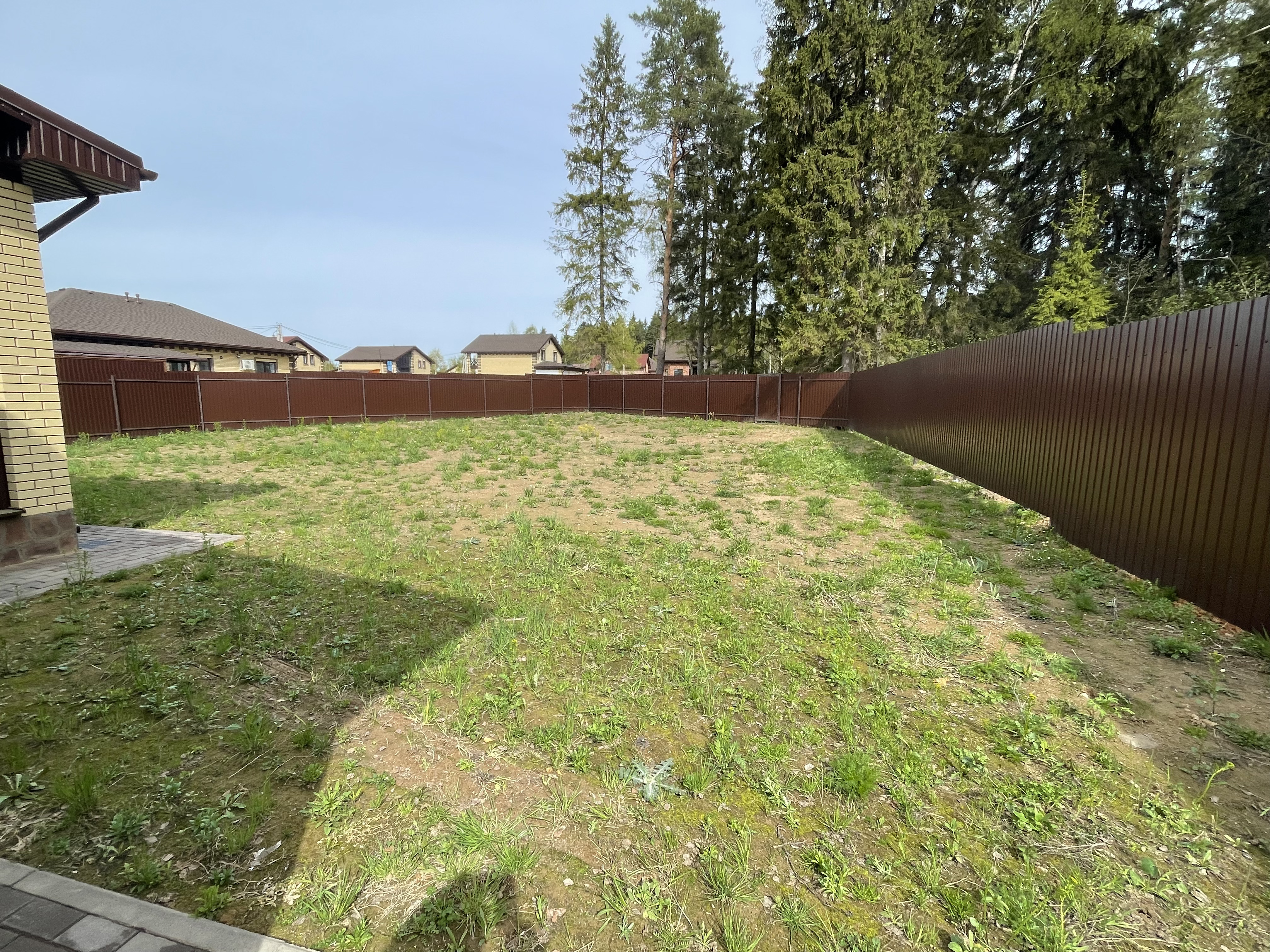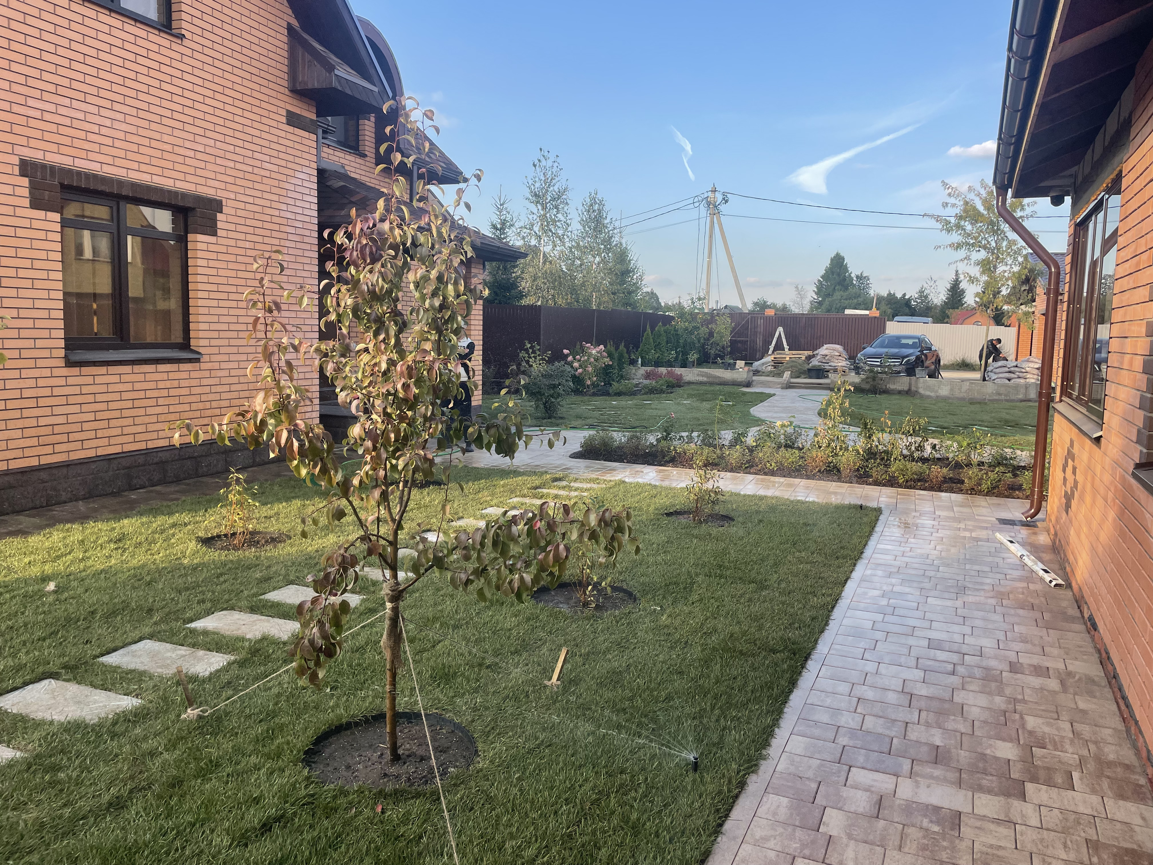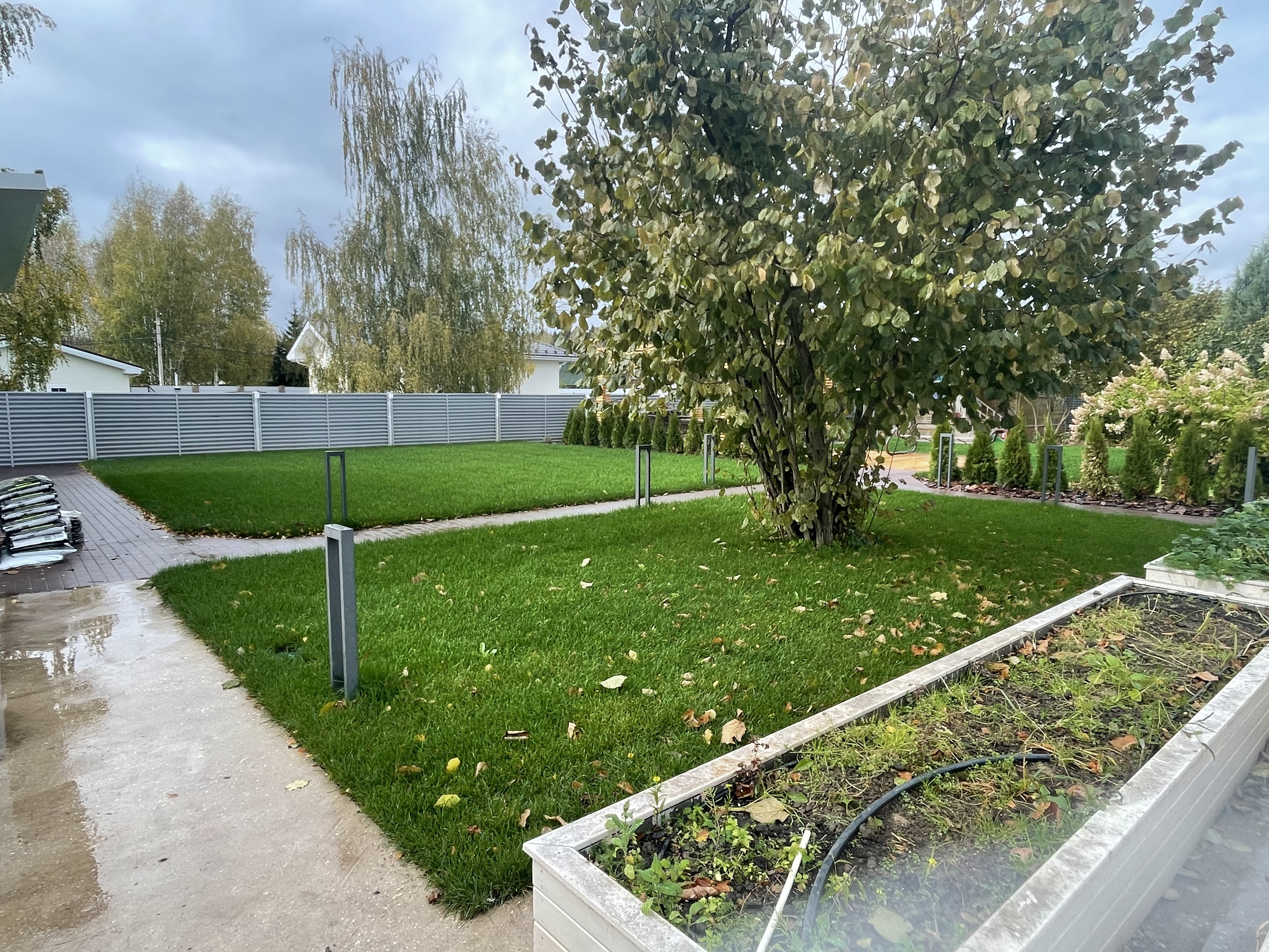 Газон вокруг дома и высадка деревьев. Дом на участке 1500 м²
