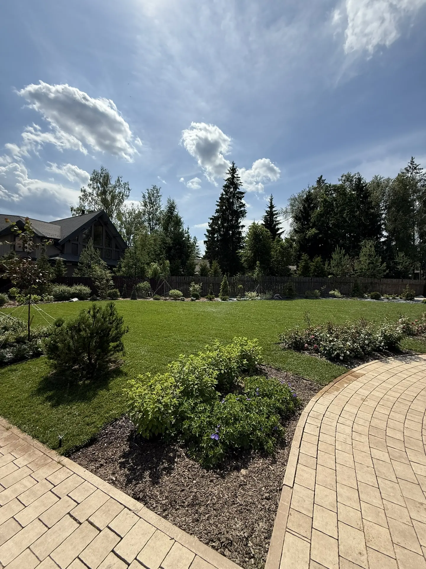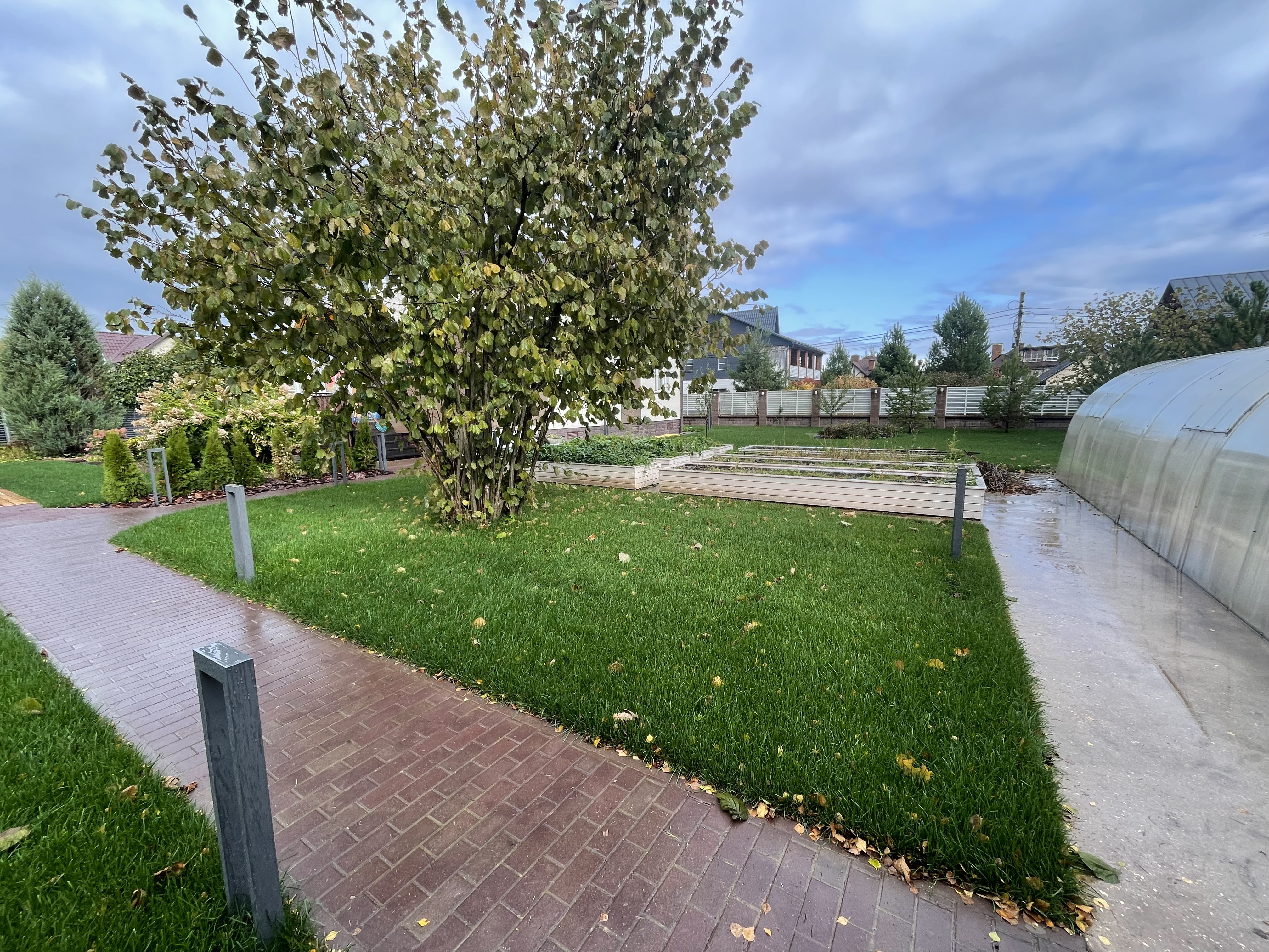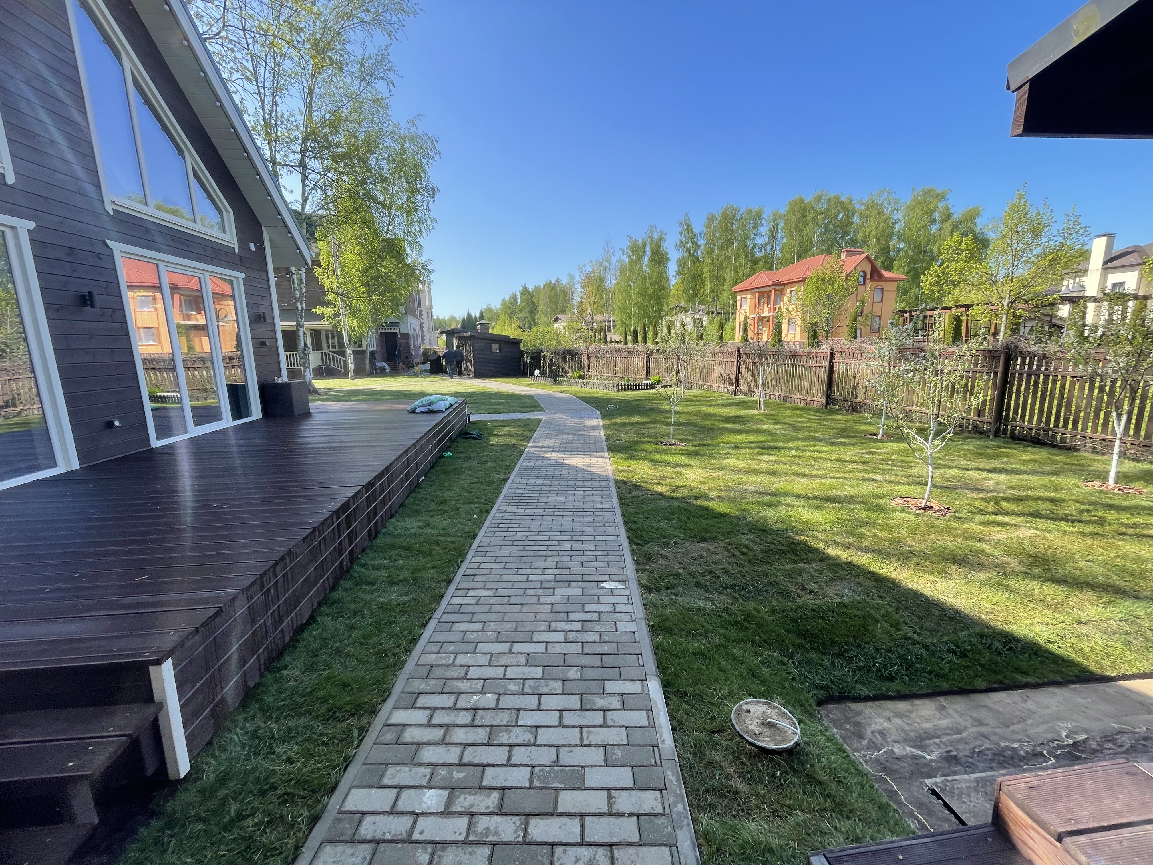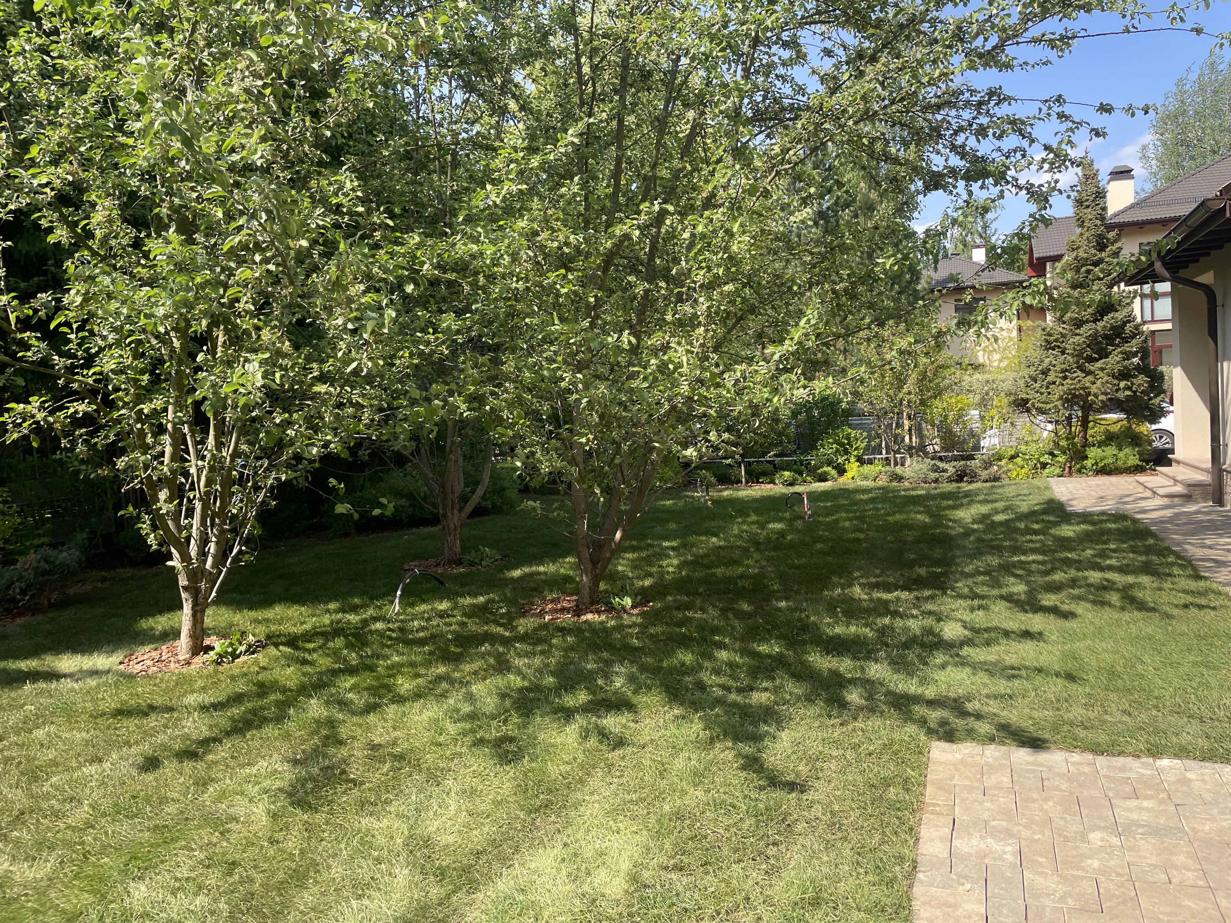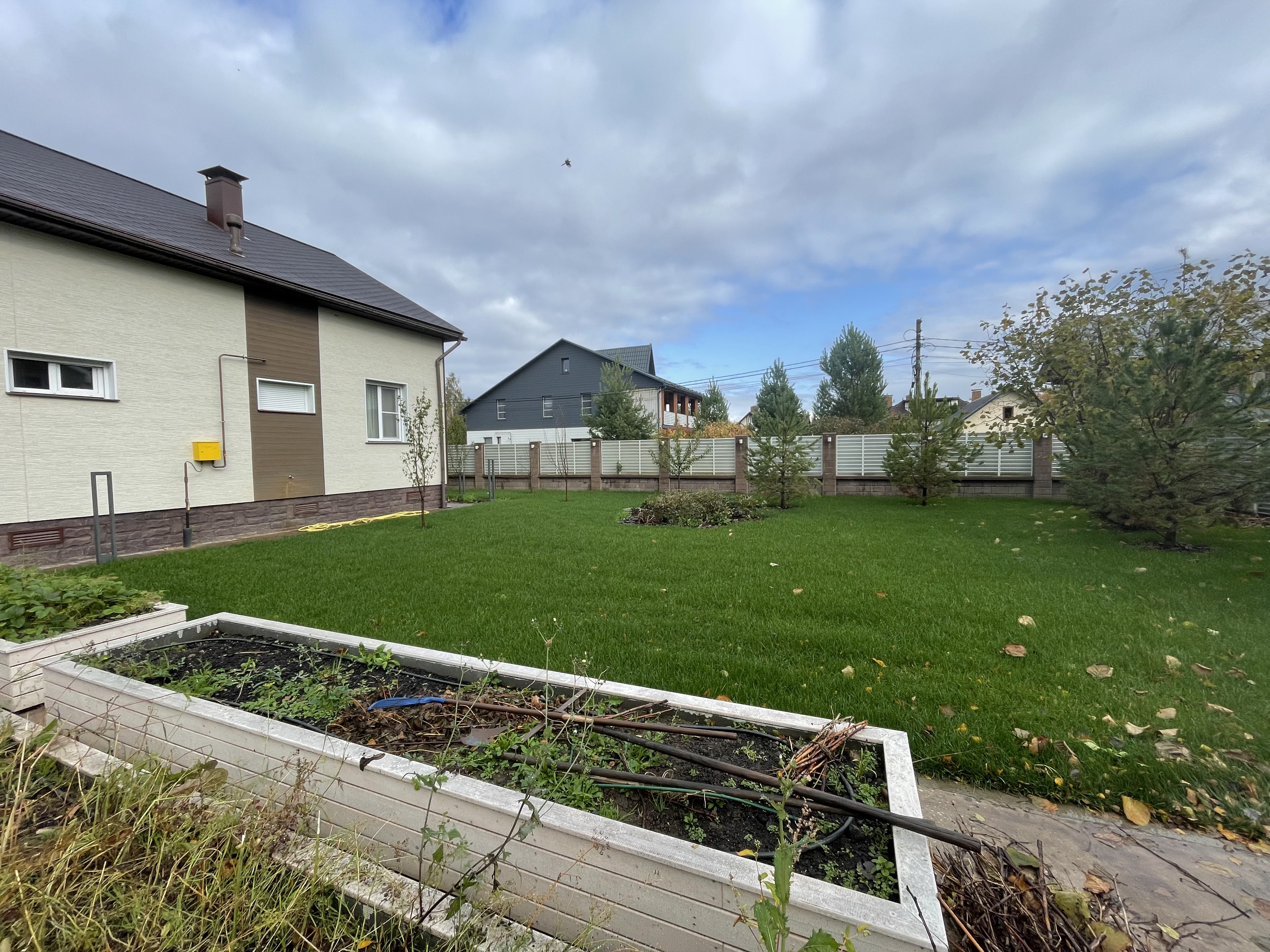 Газон вокруг дома и высадка деревьев. Дом на участке 1500 м²