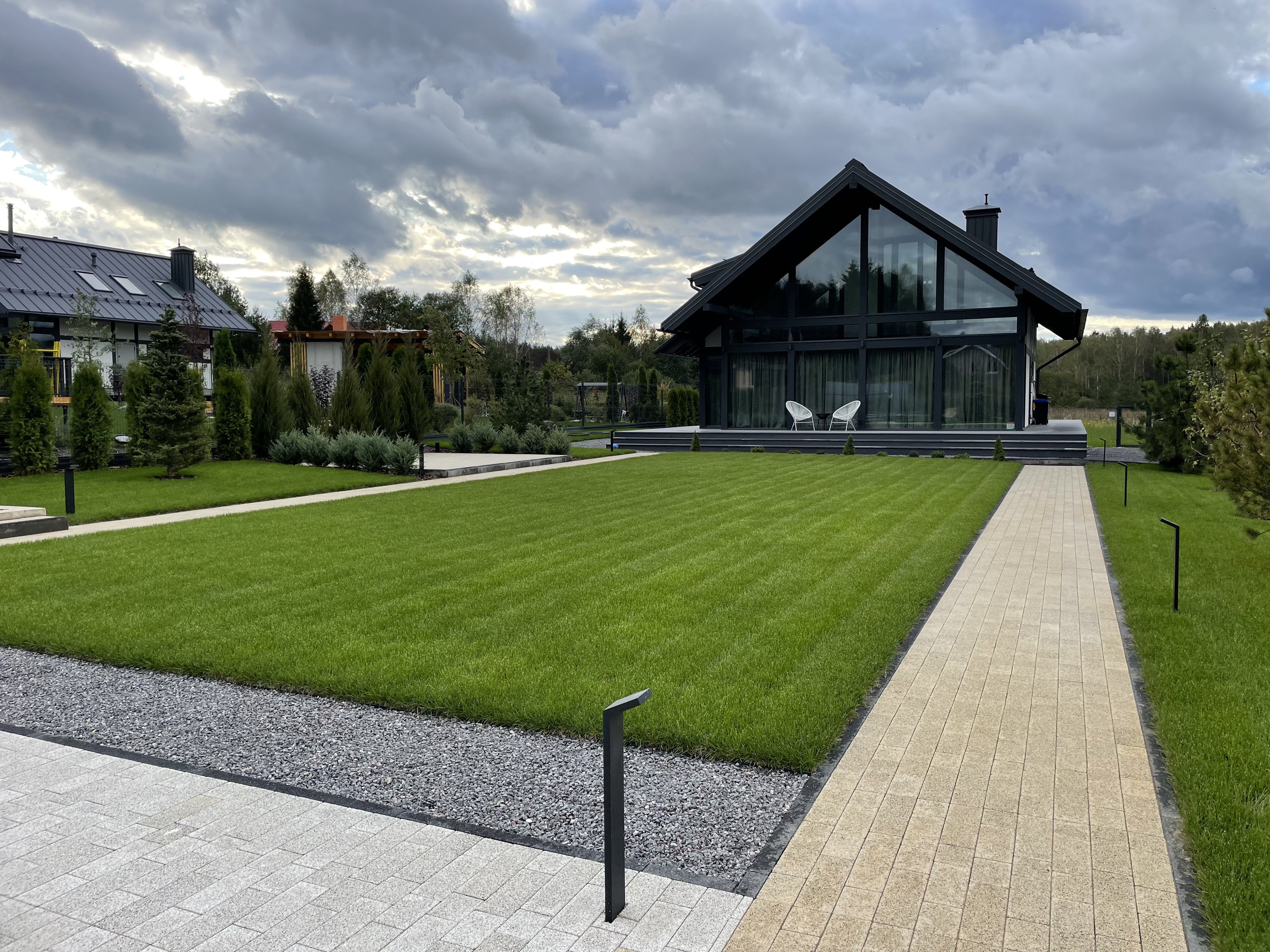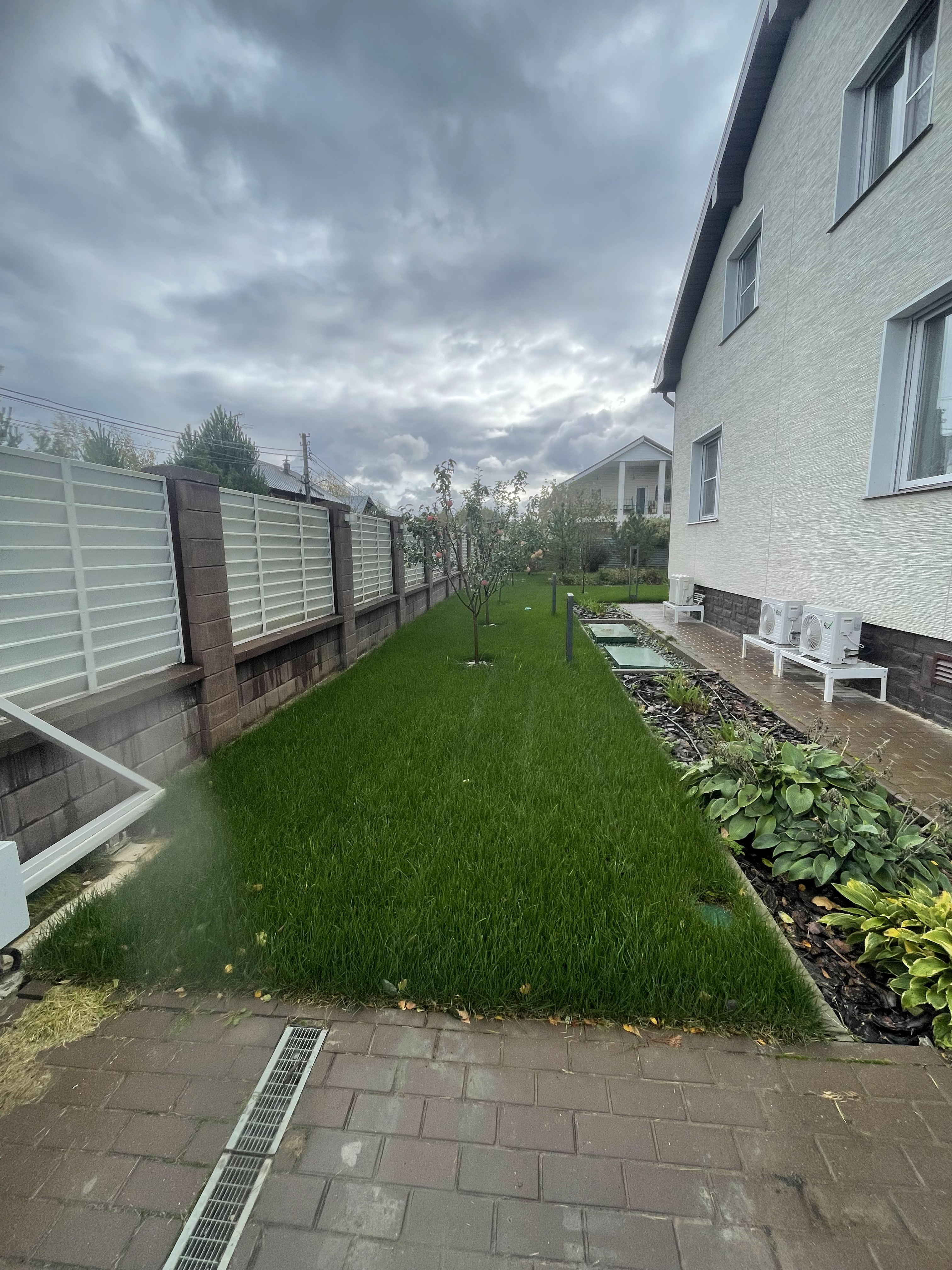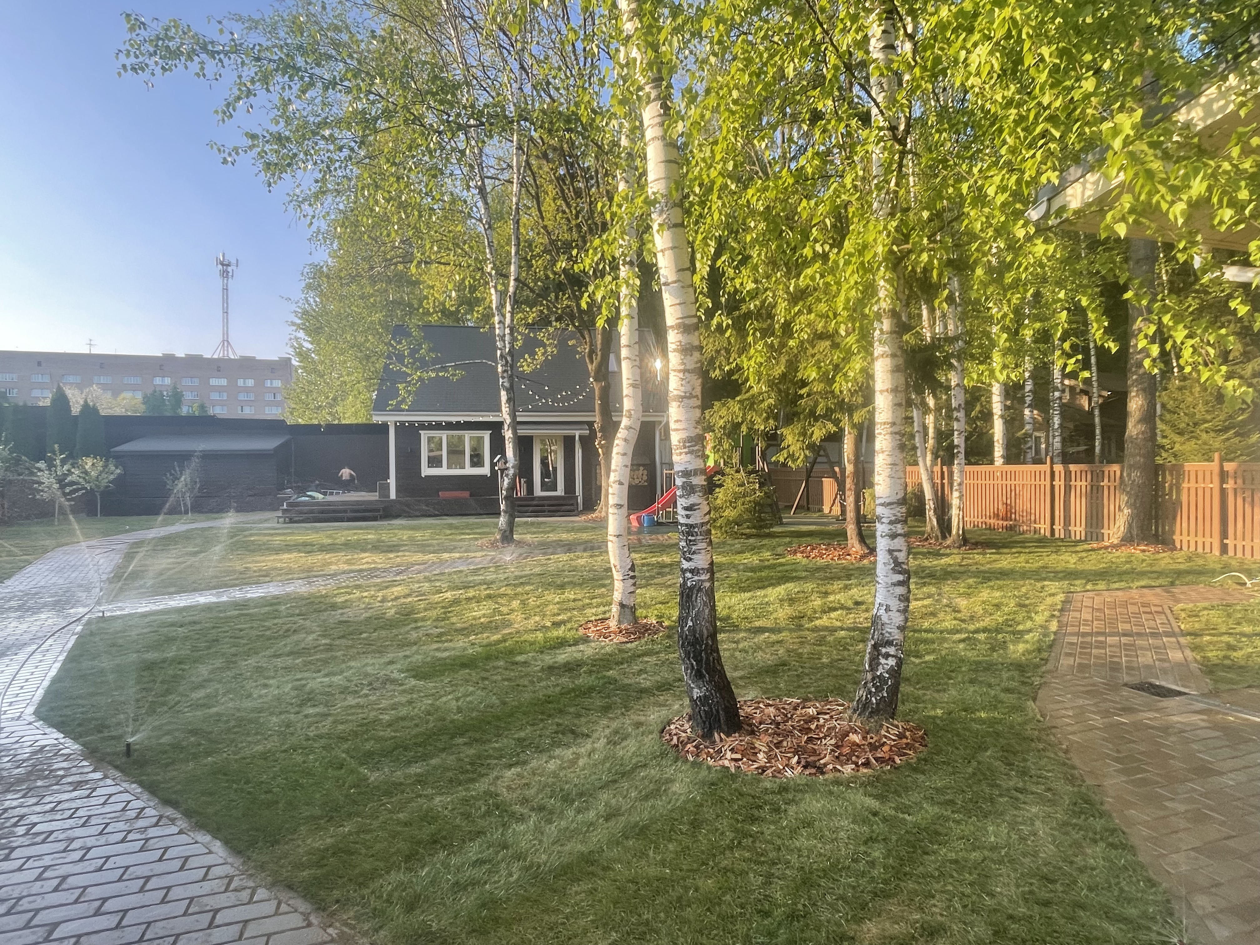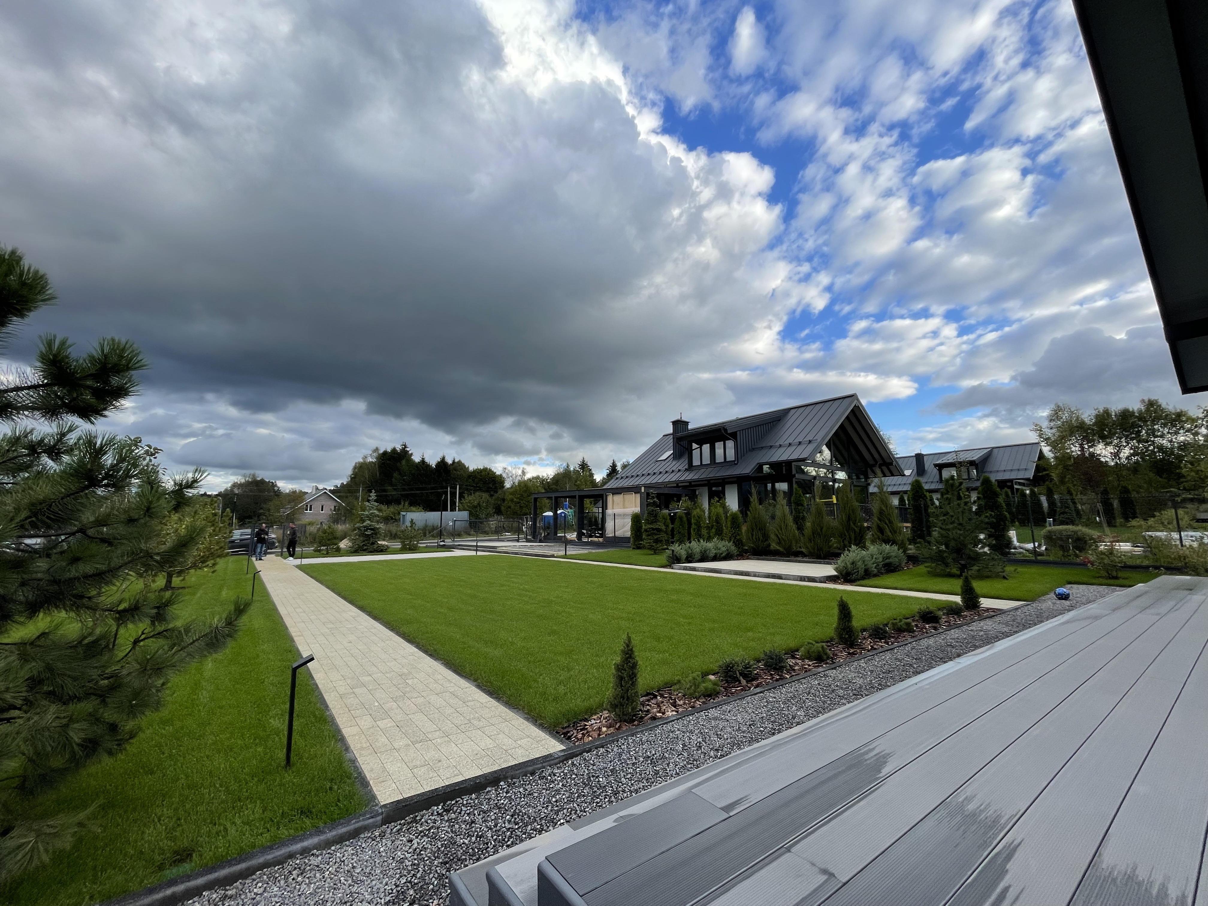 Газон вокруг дома и высадка деревьев. Дом на участке 1500 м²