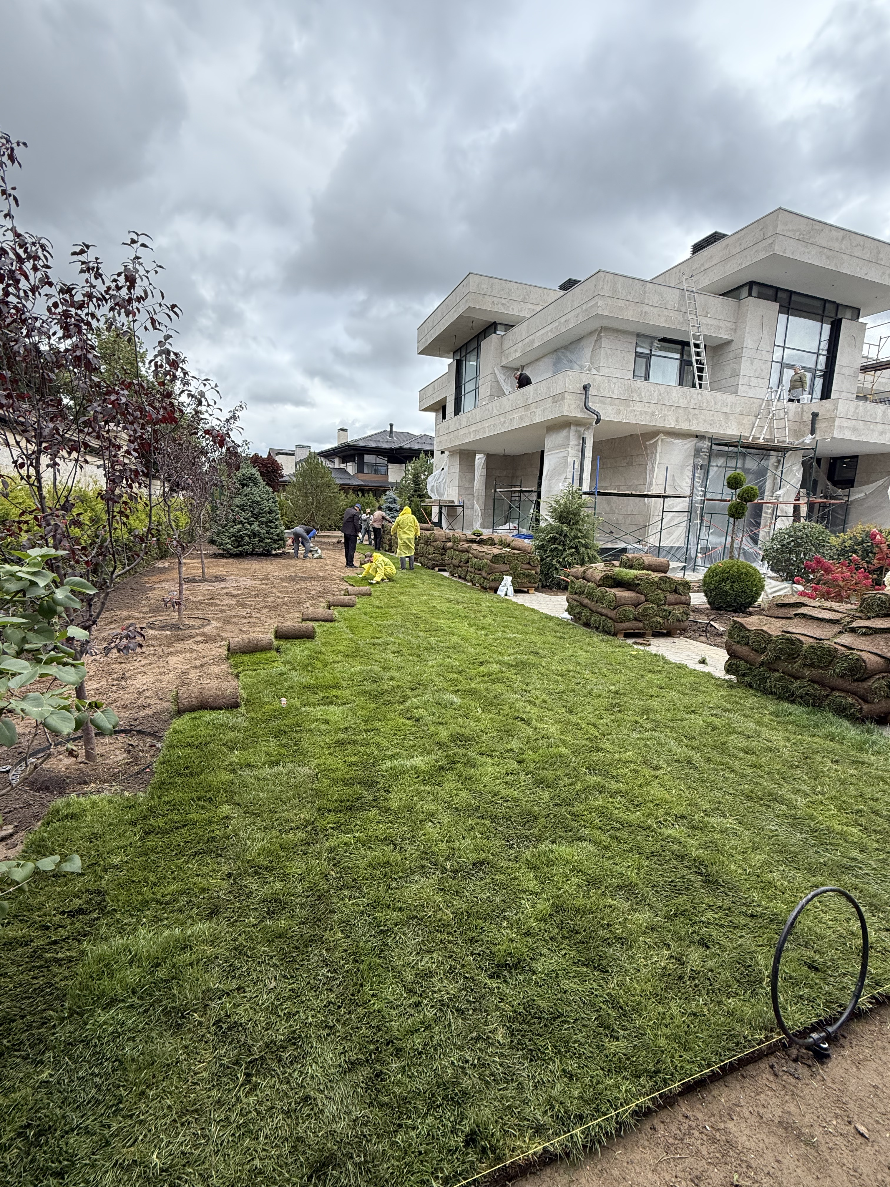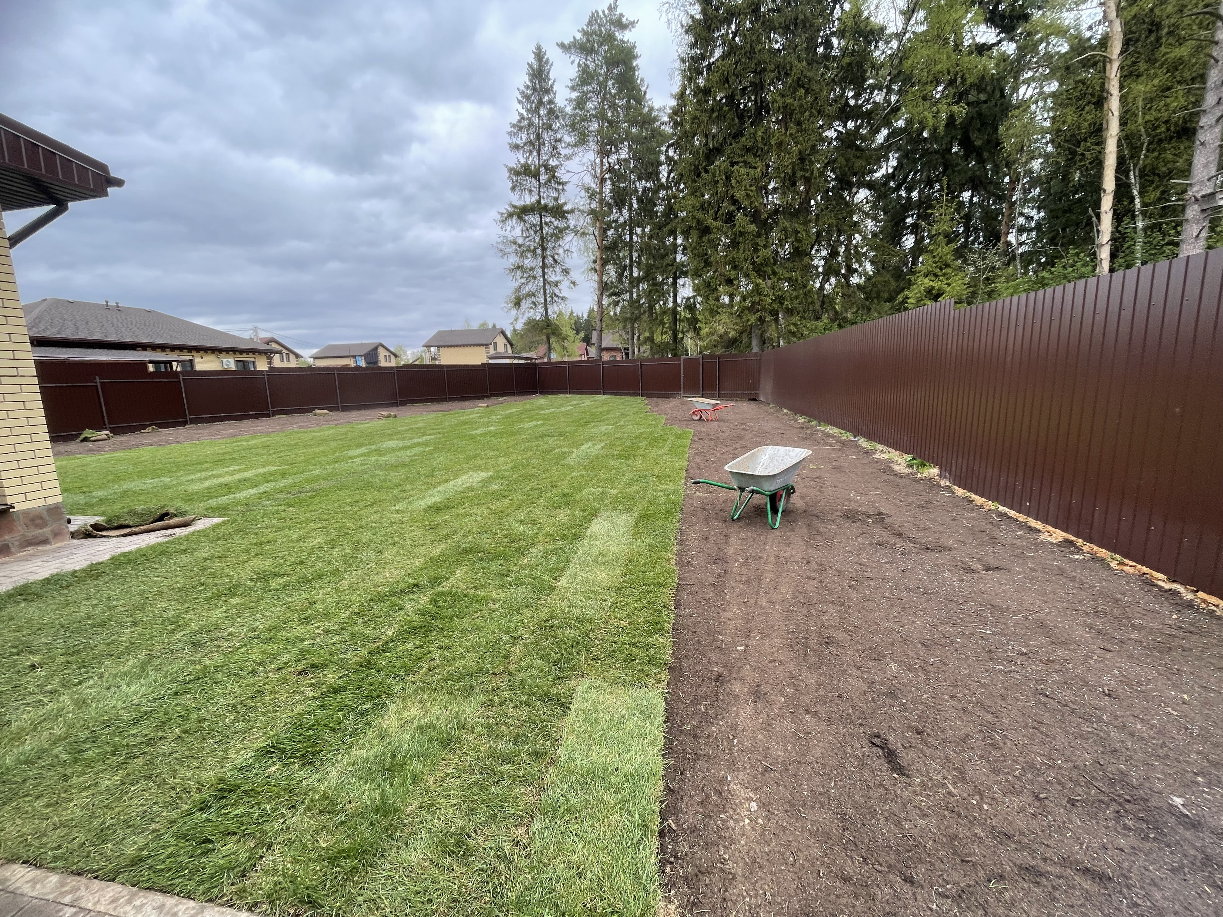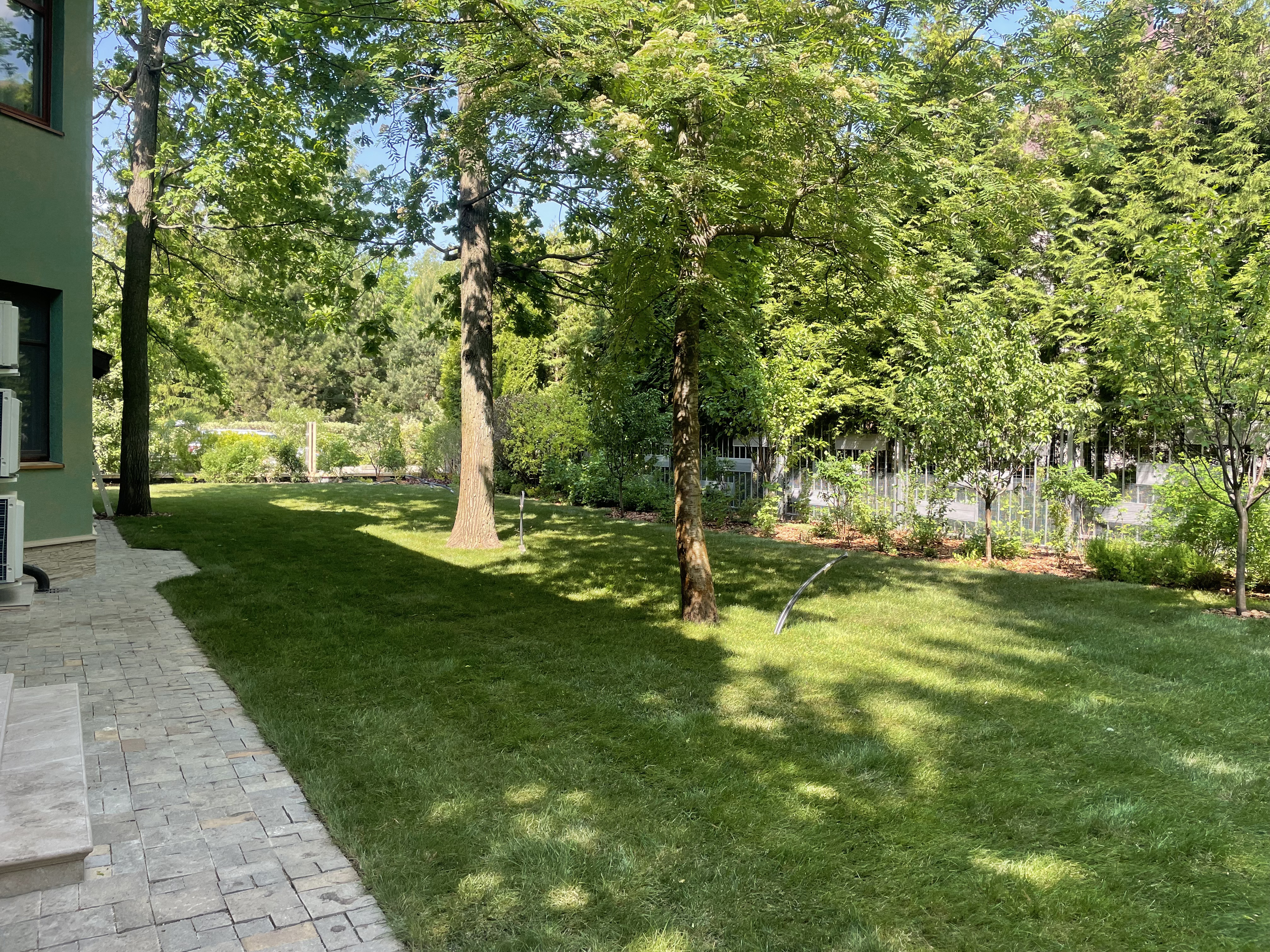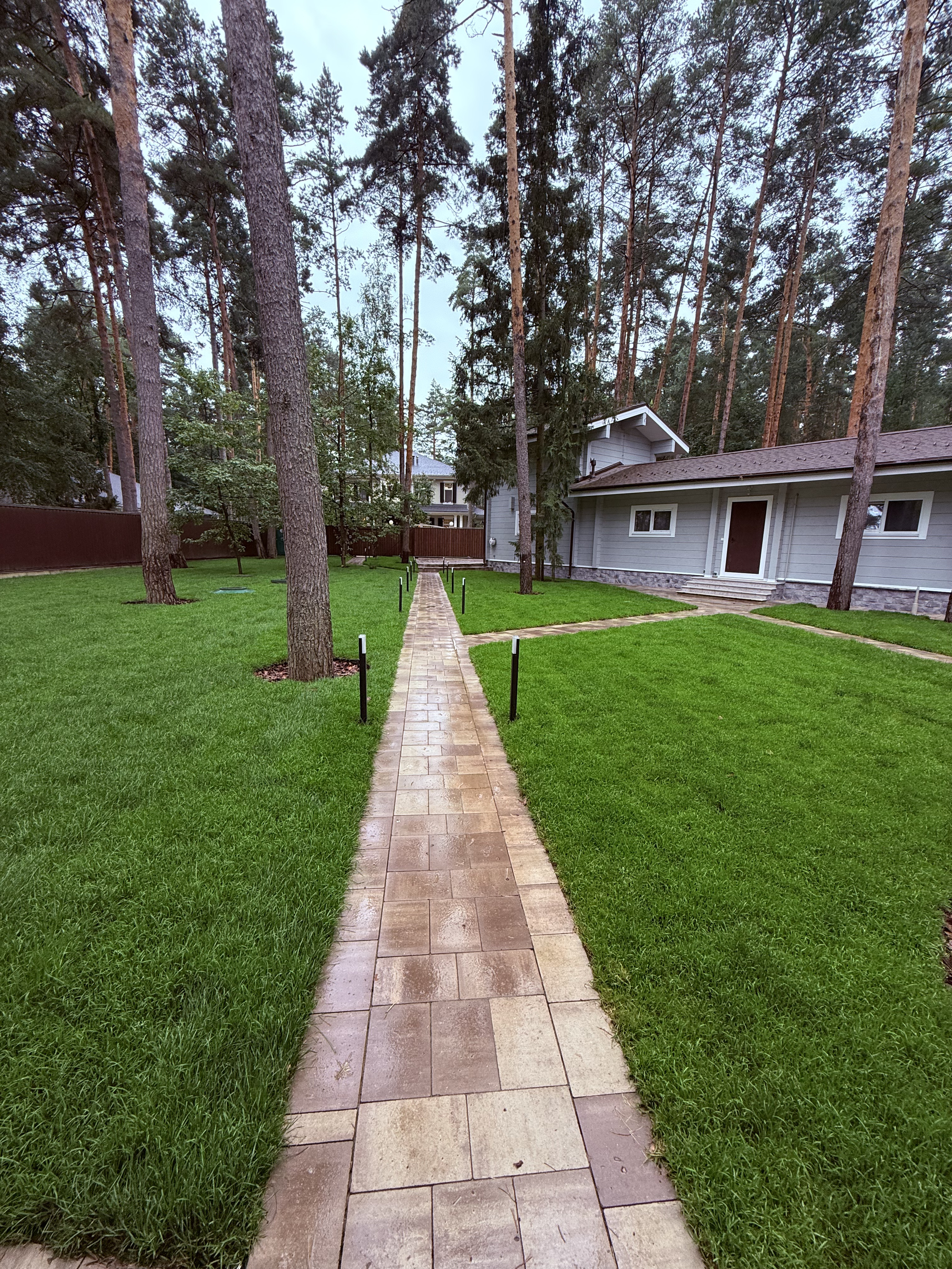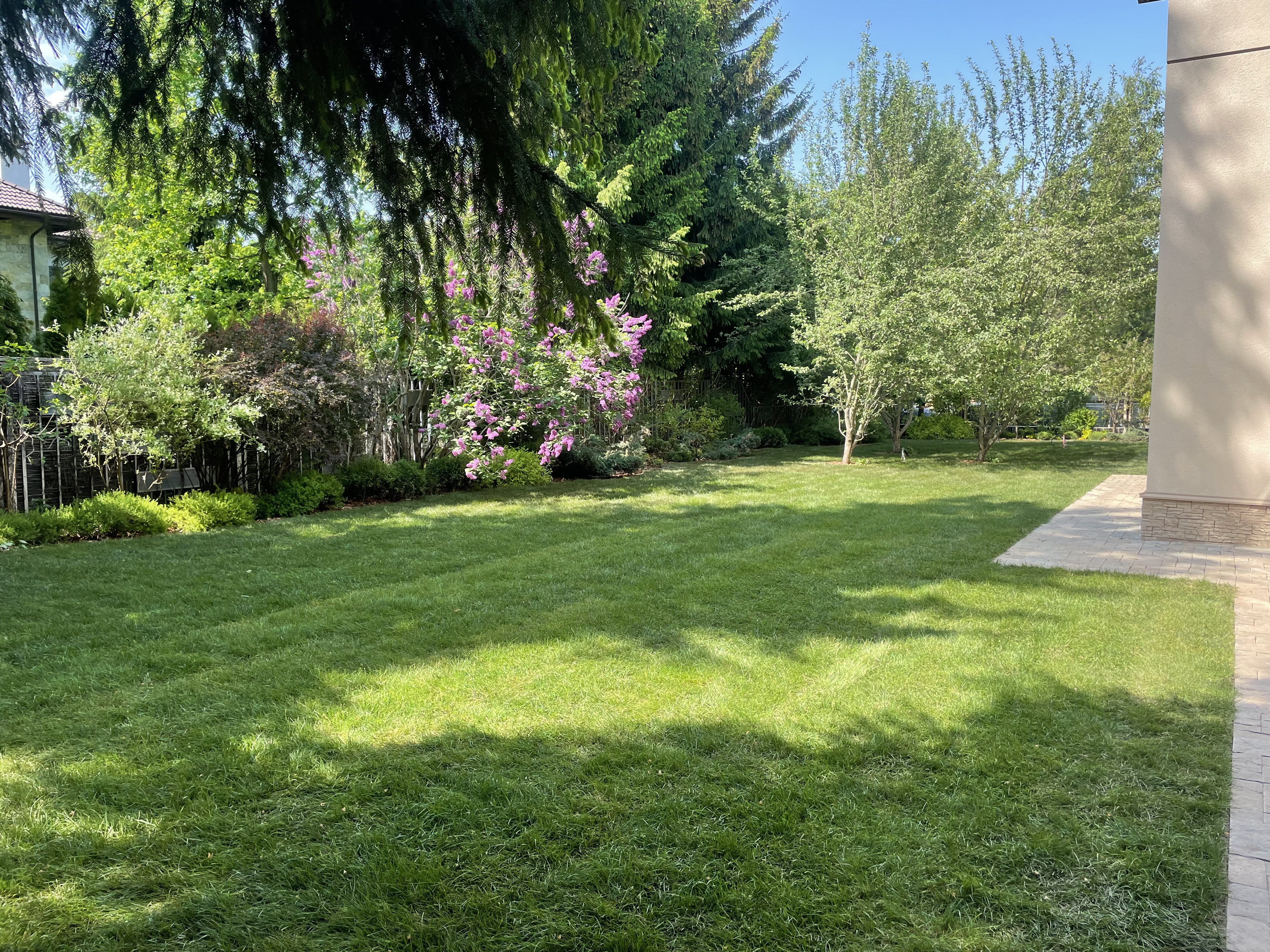 Газон вокруг дома и высадка деревьев. Дом на участке 1500 м²