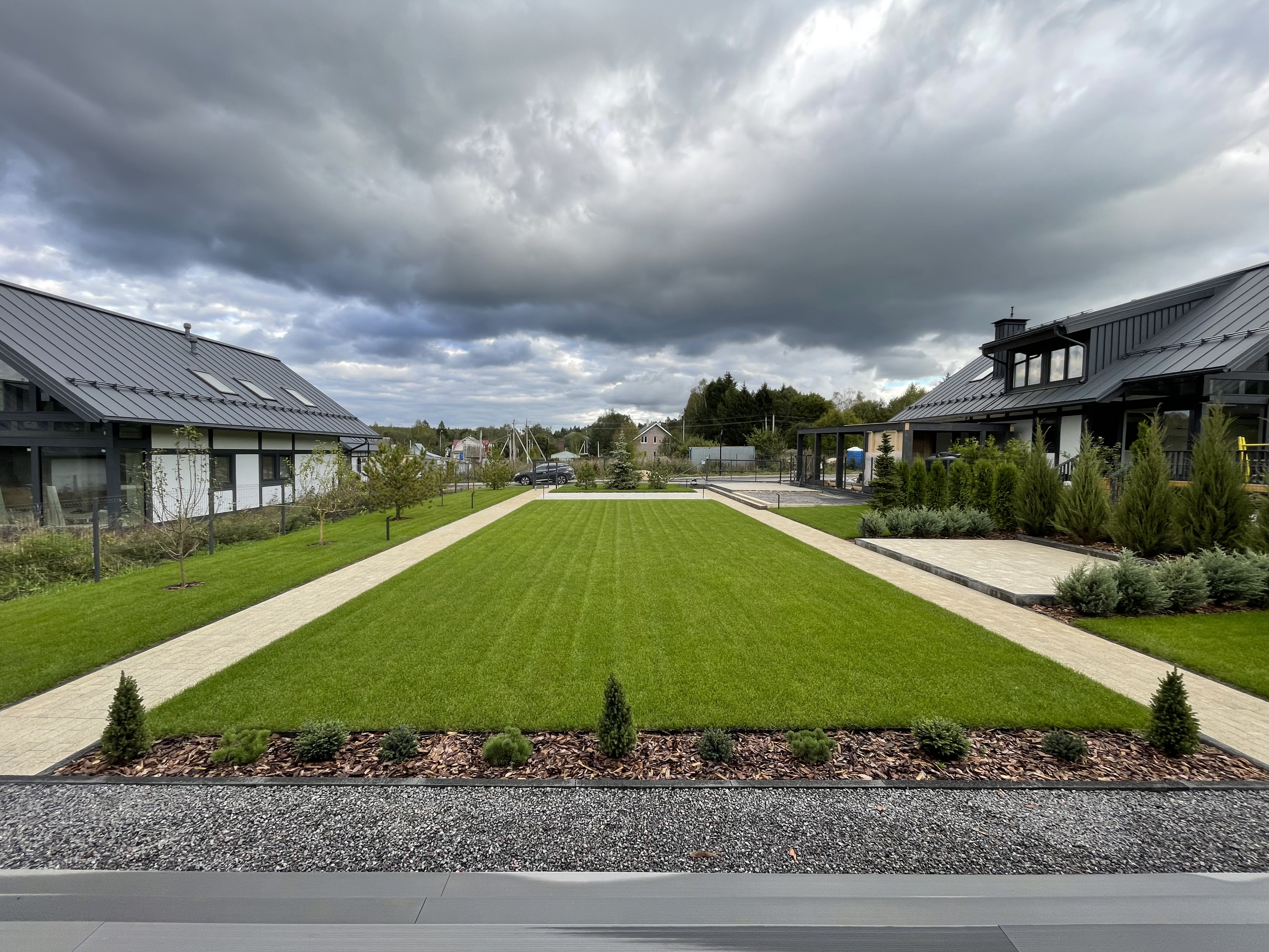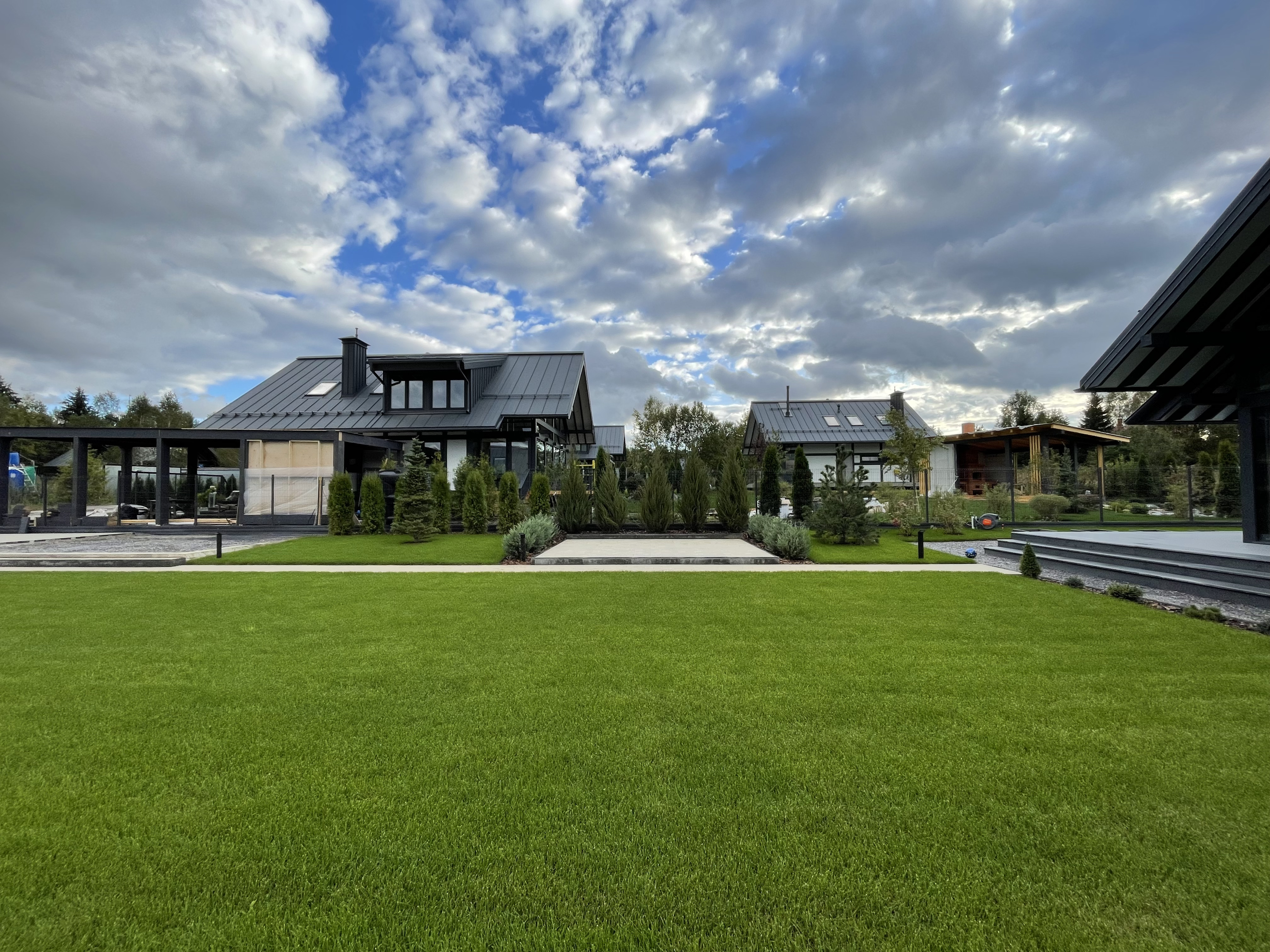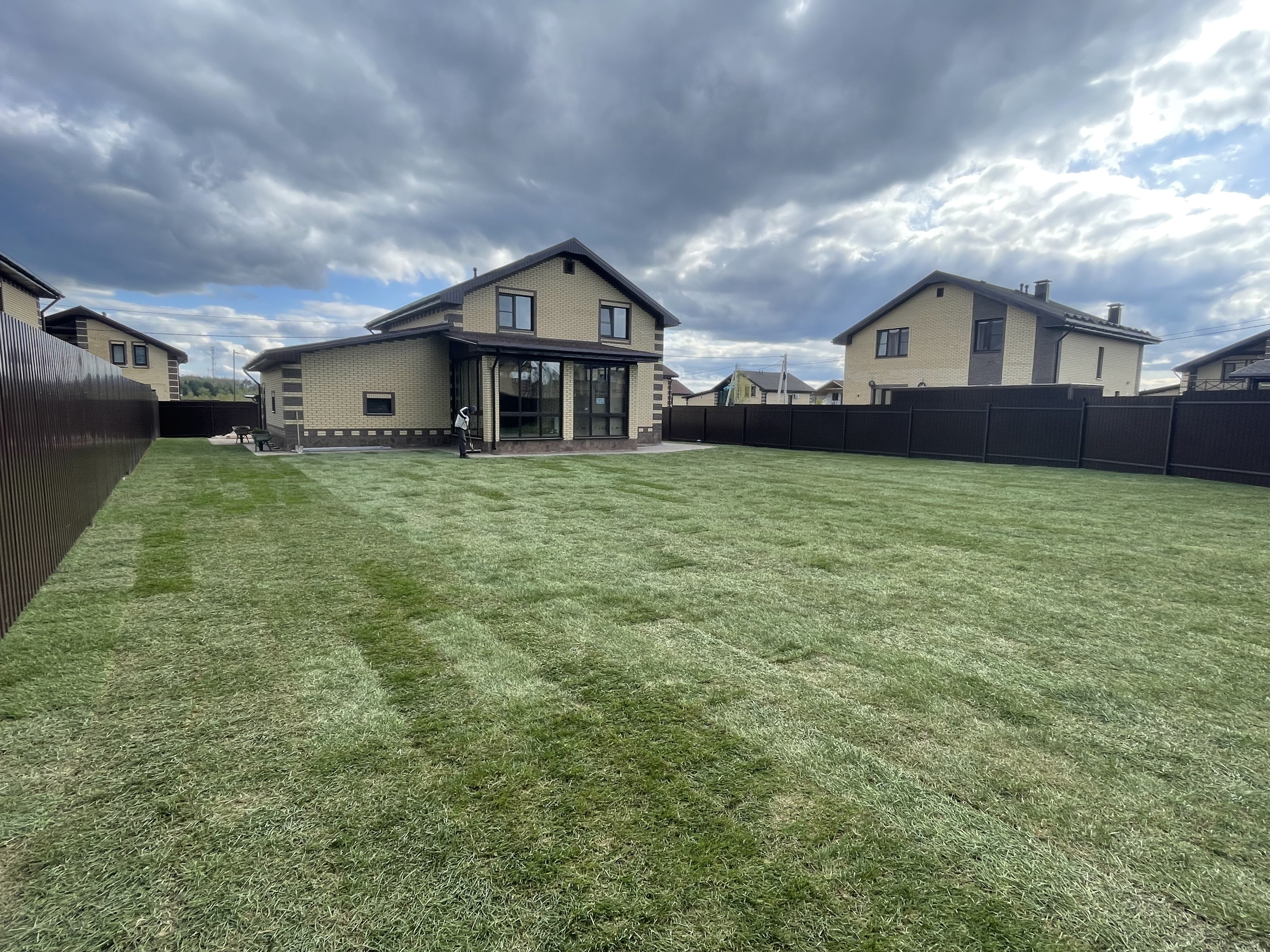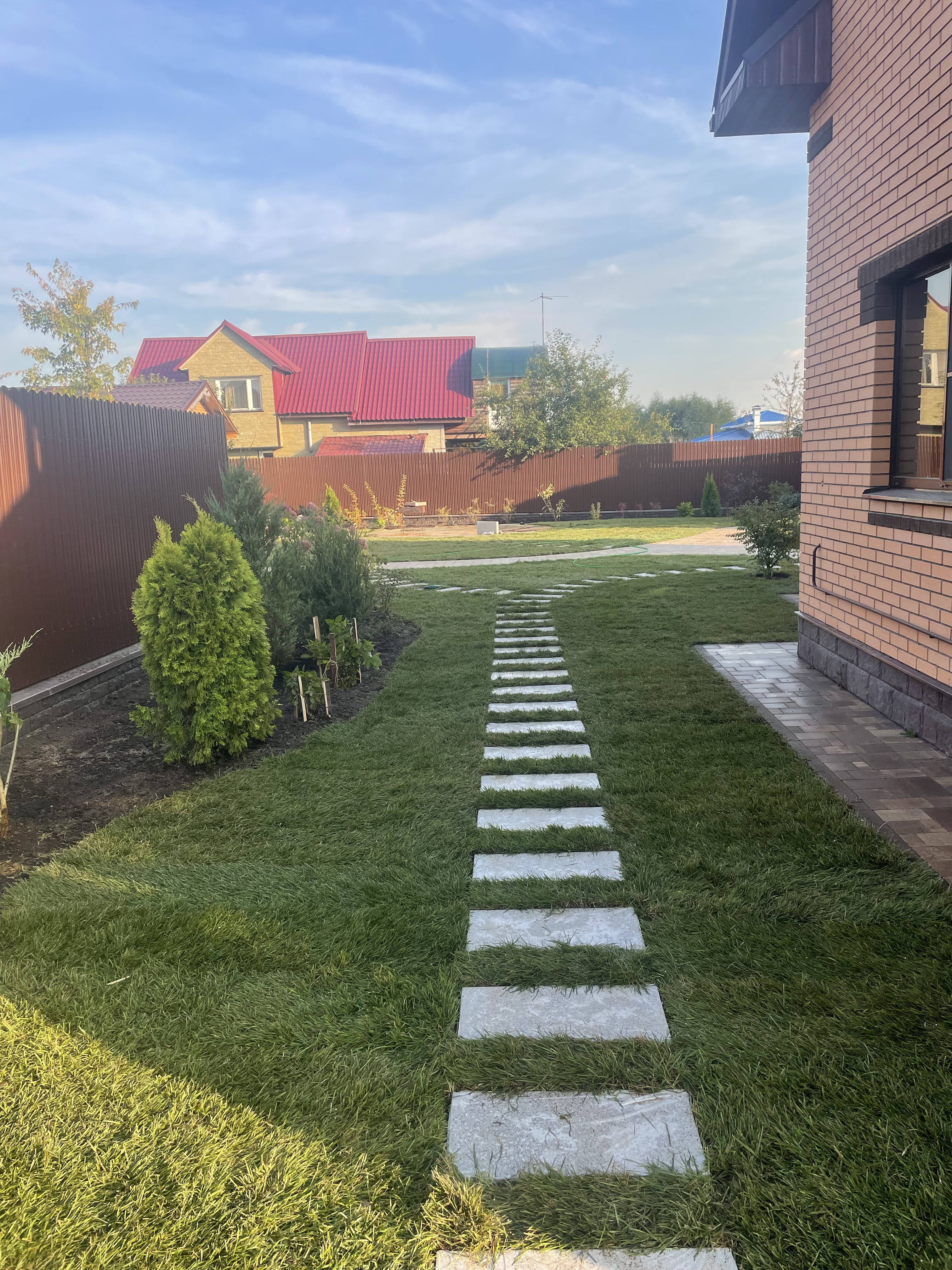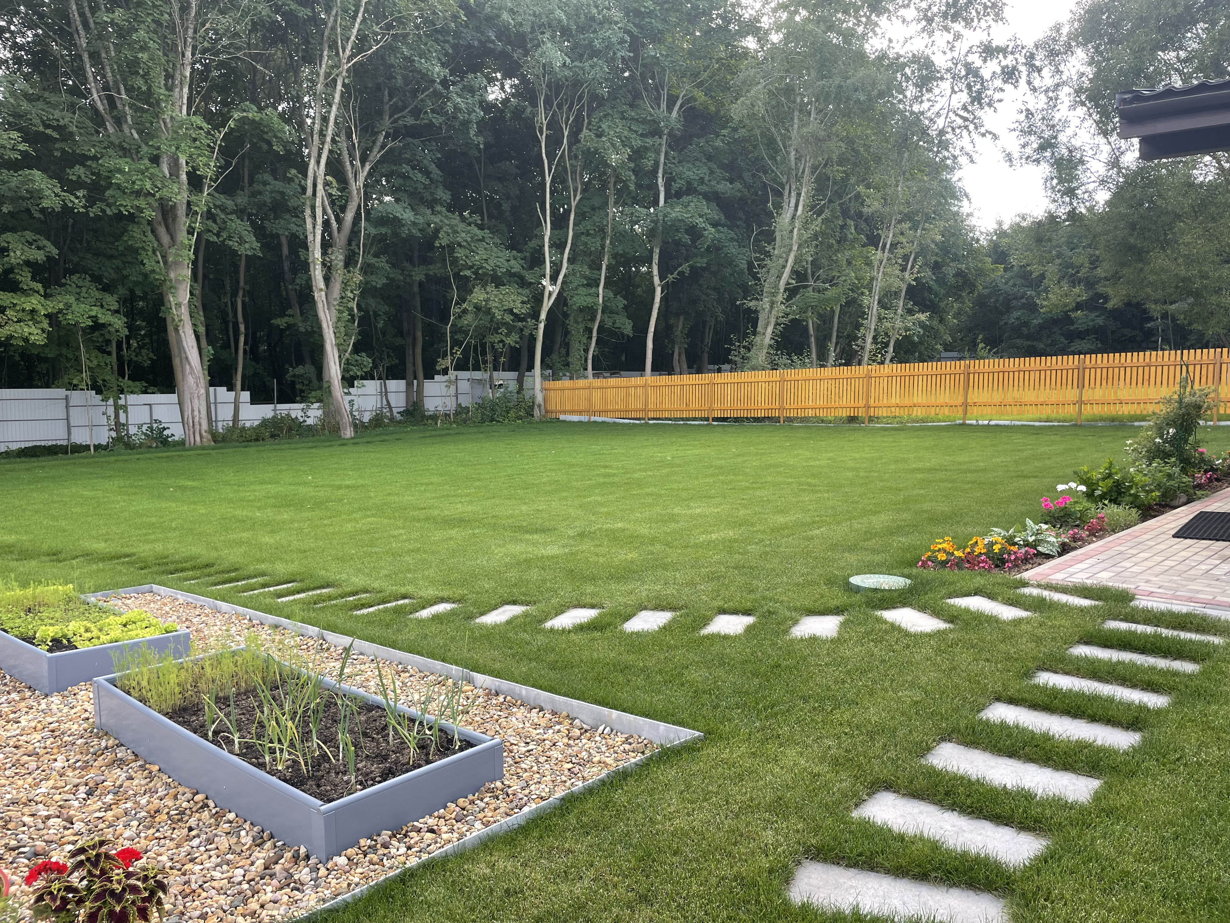 Газон вокруг дома и высадка деревьев. Дом на участке 1500 м²