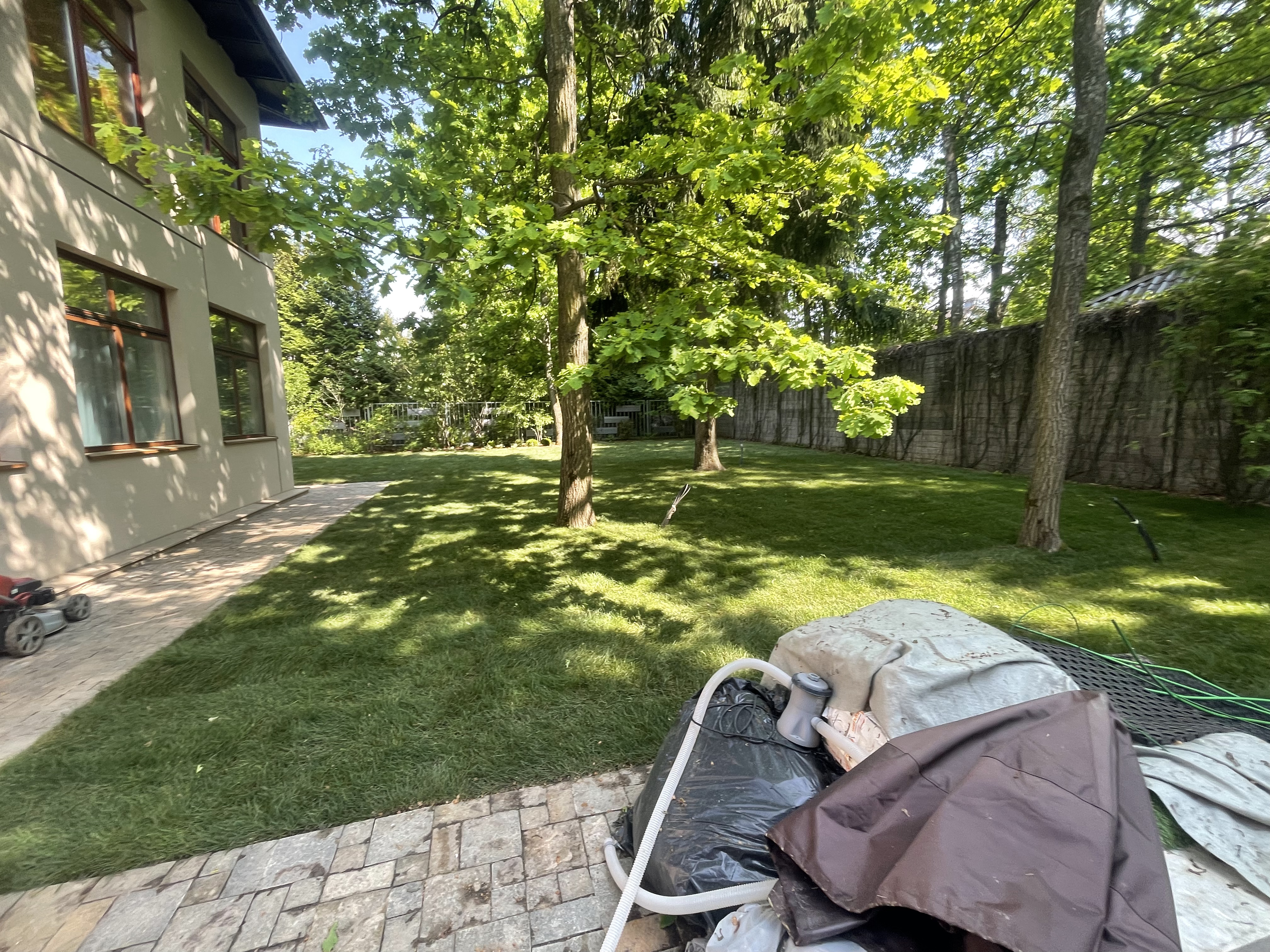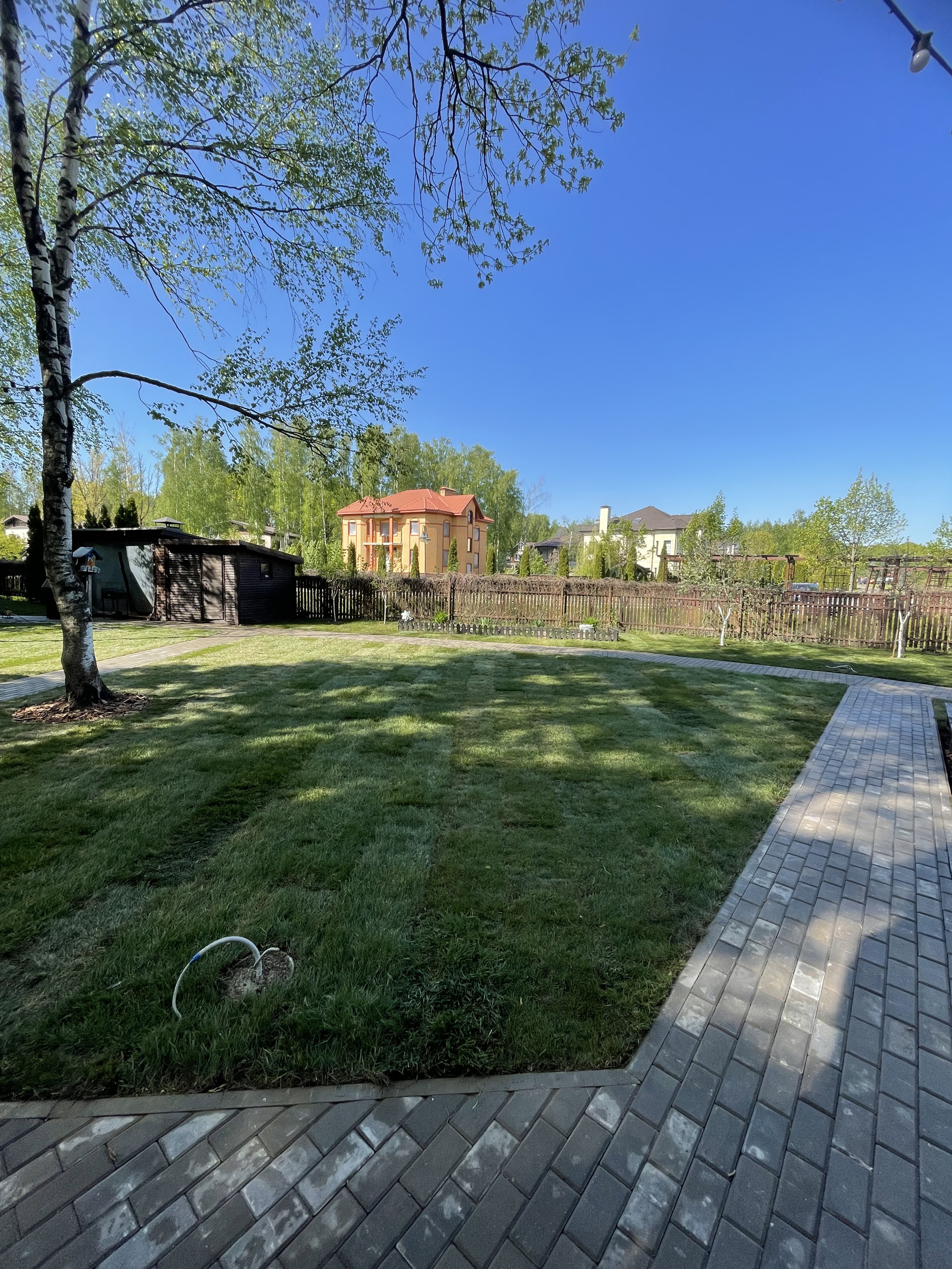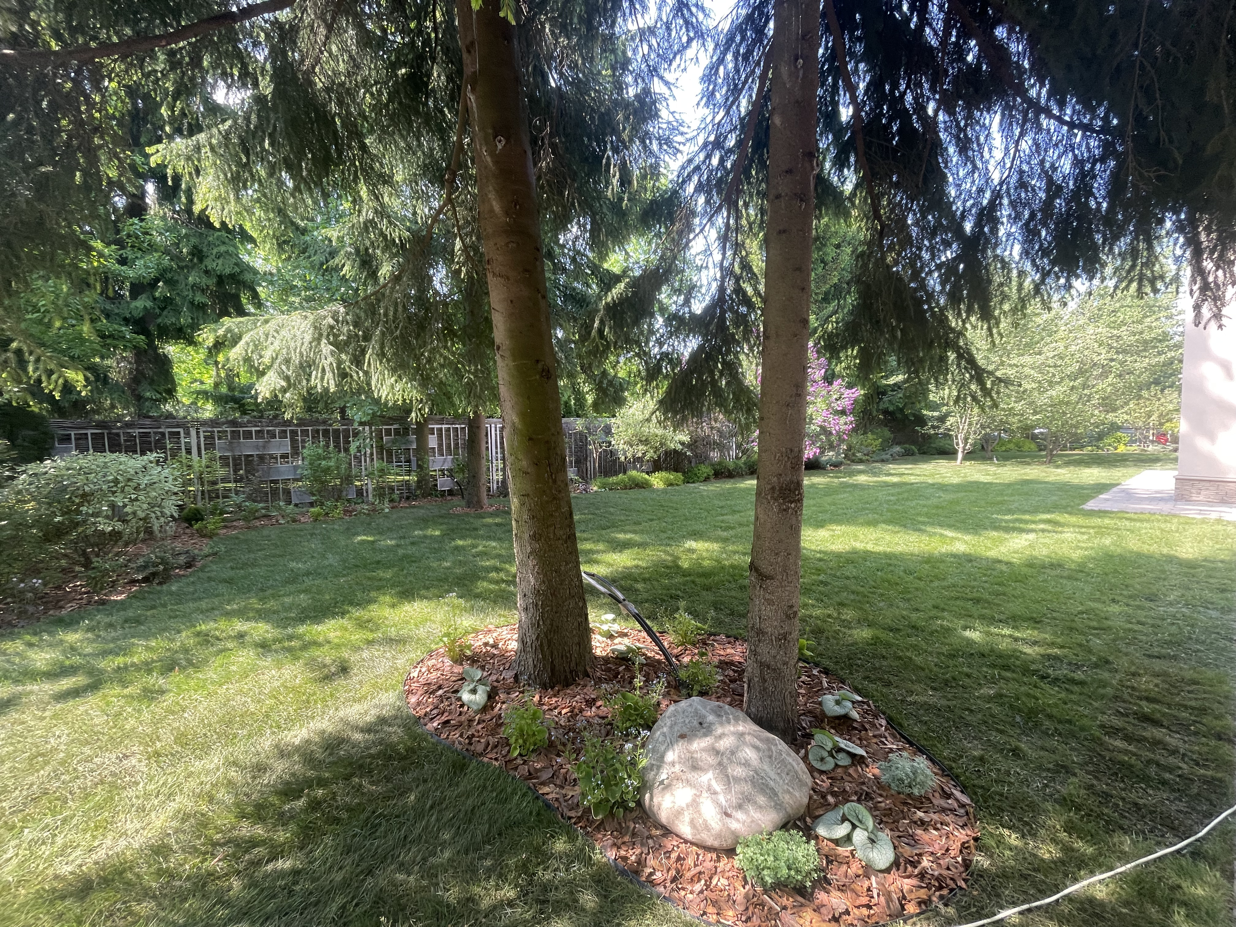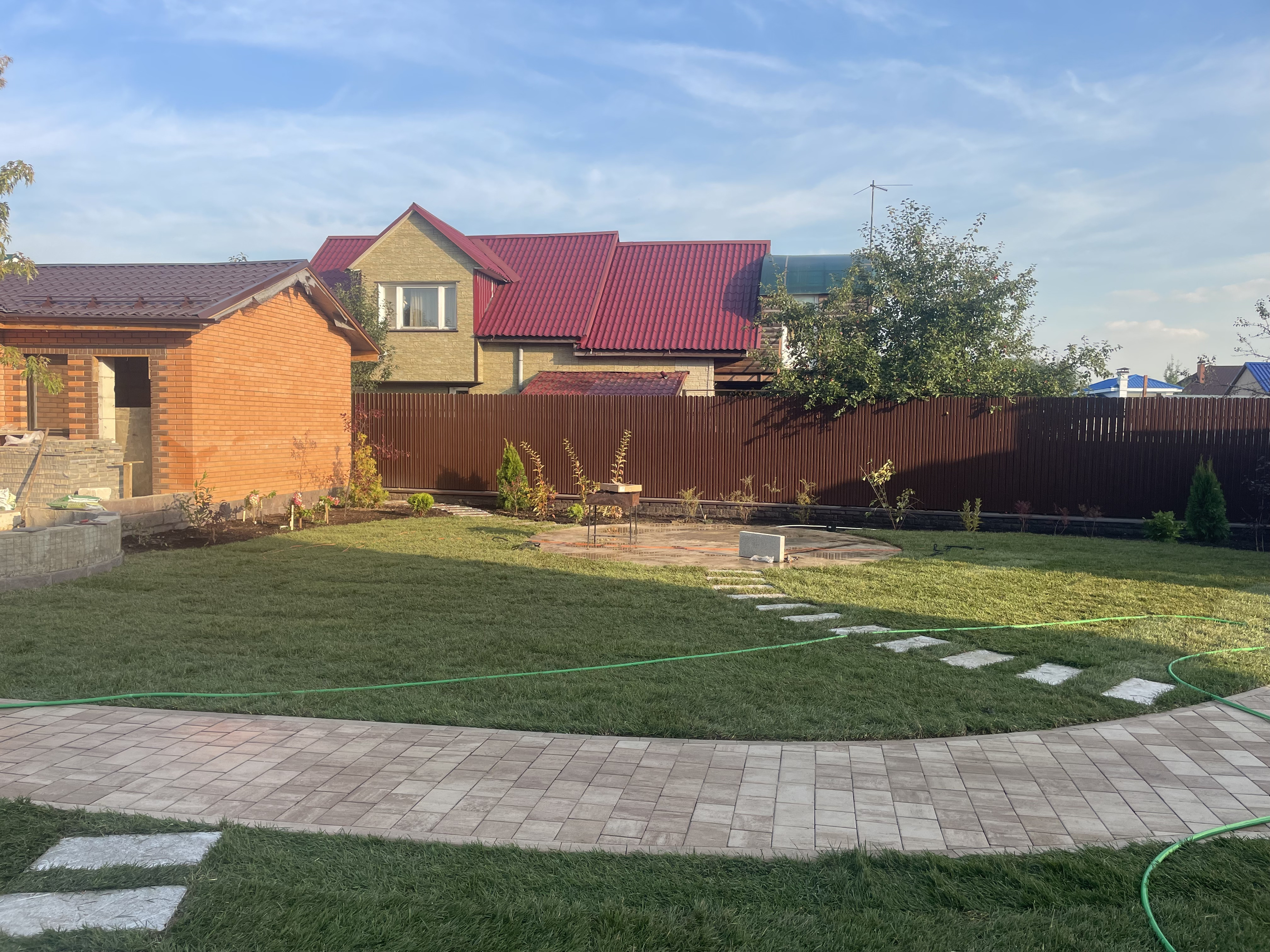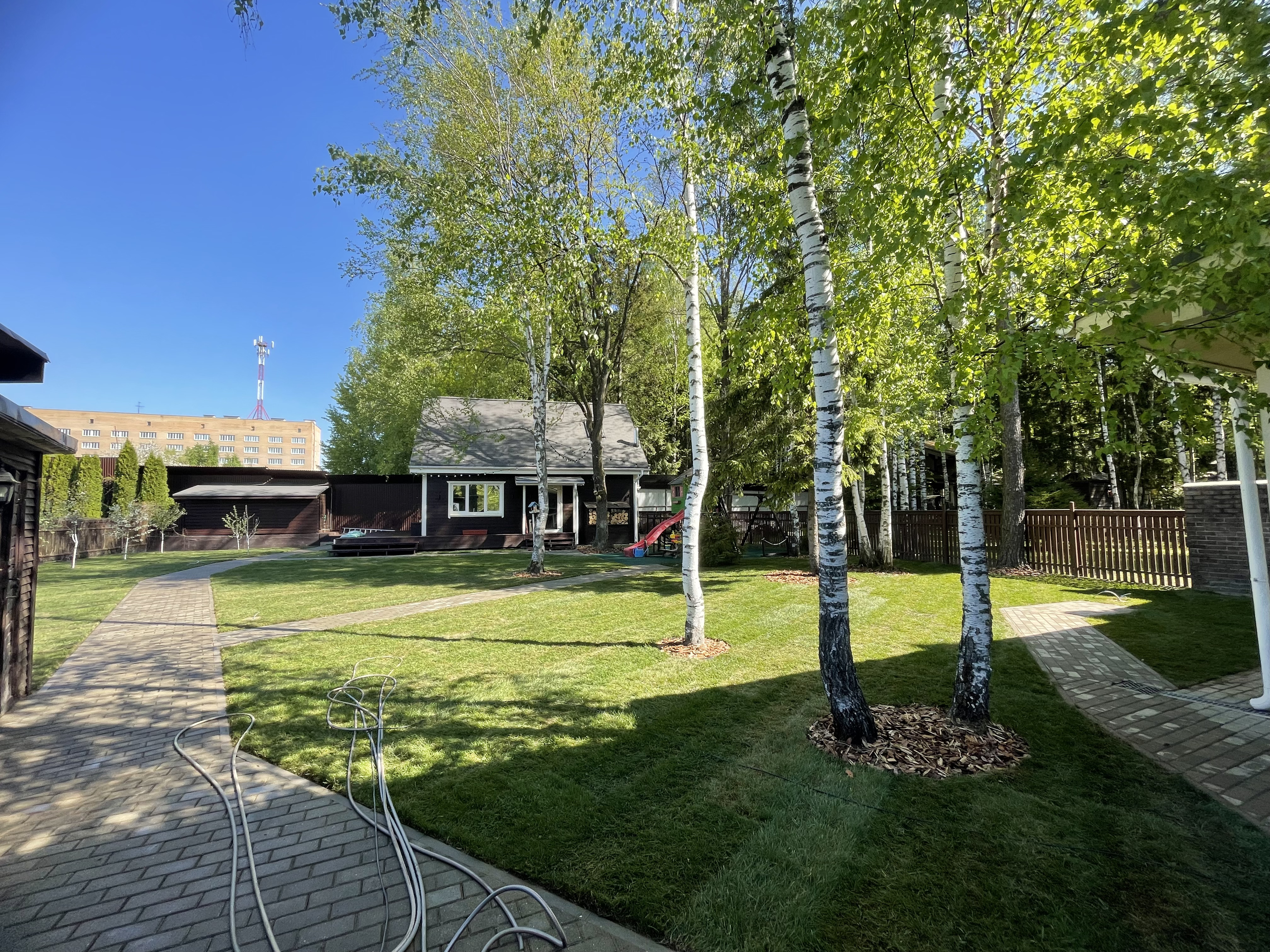 Газон вокруг дома и высадка деревьев. Дом на участке 1500 м²